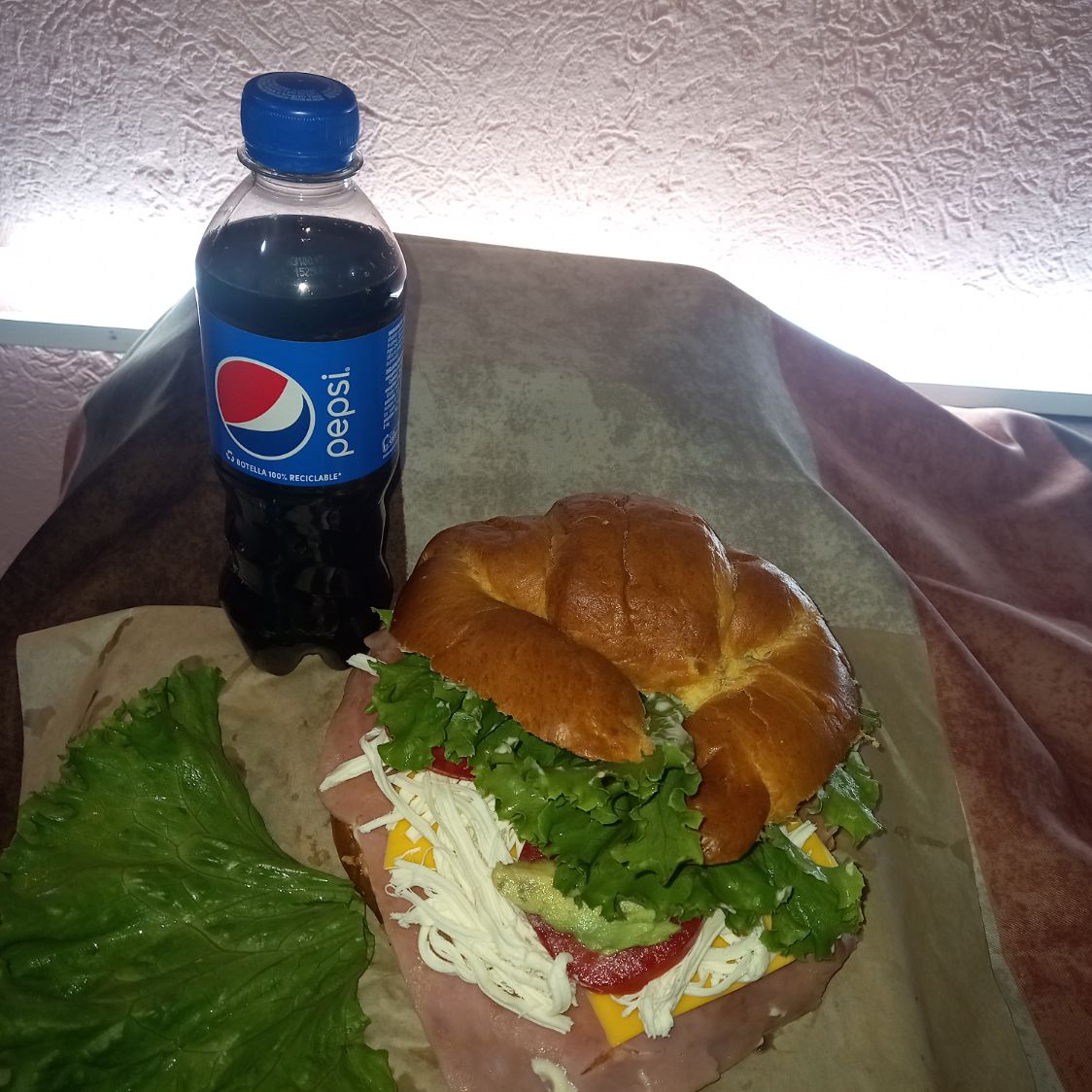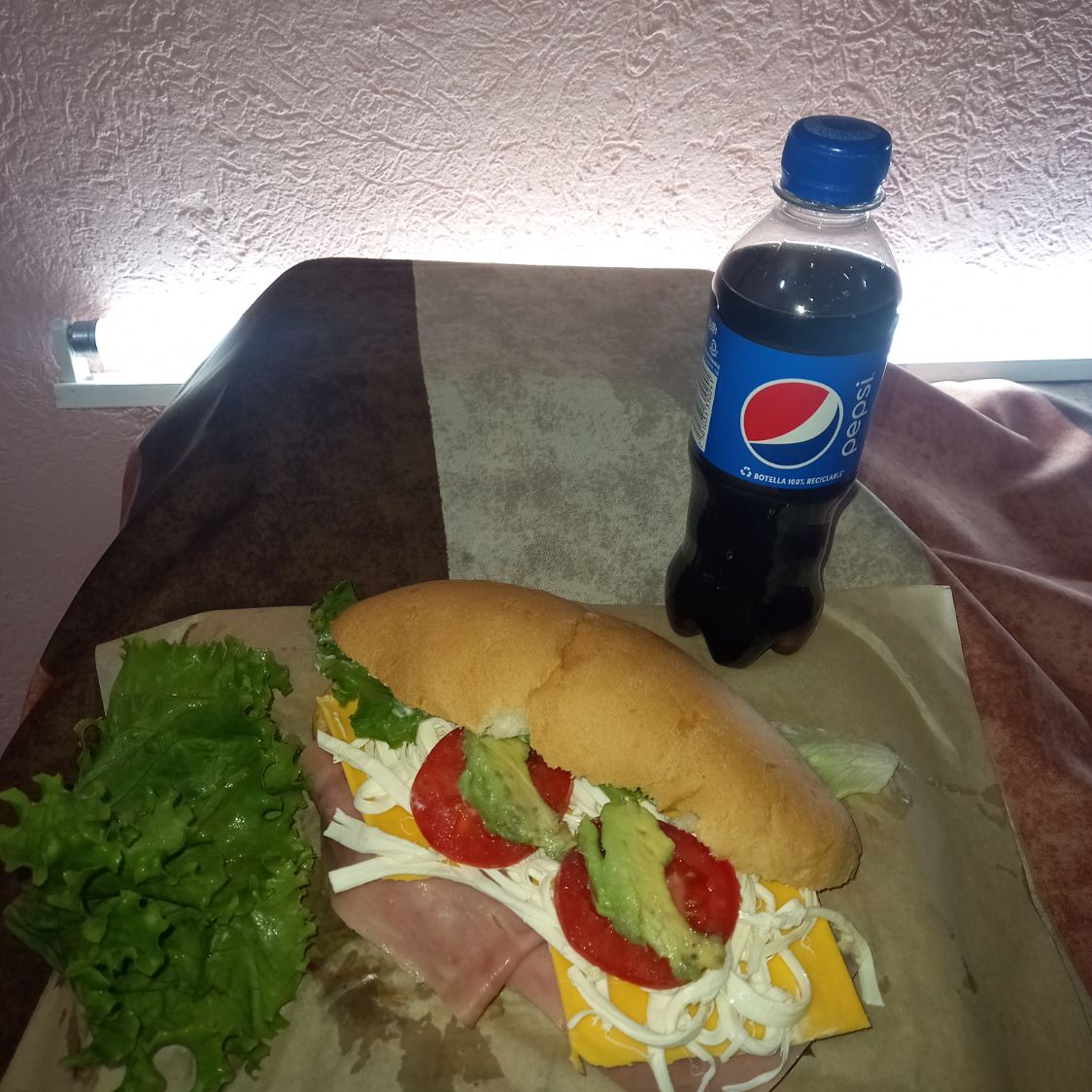 Torta de jamón acompañado de un refresco de 355 mililitros de la línea Pepsi.
