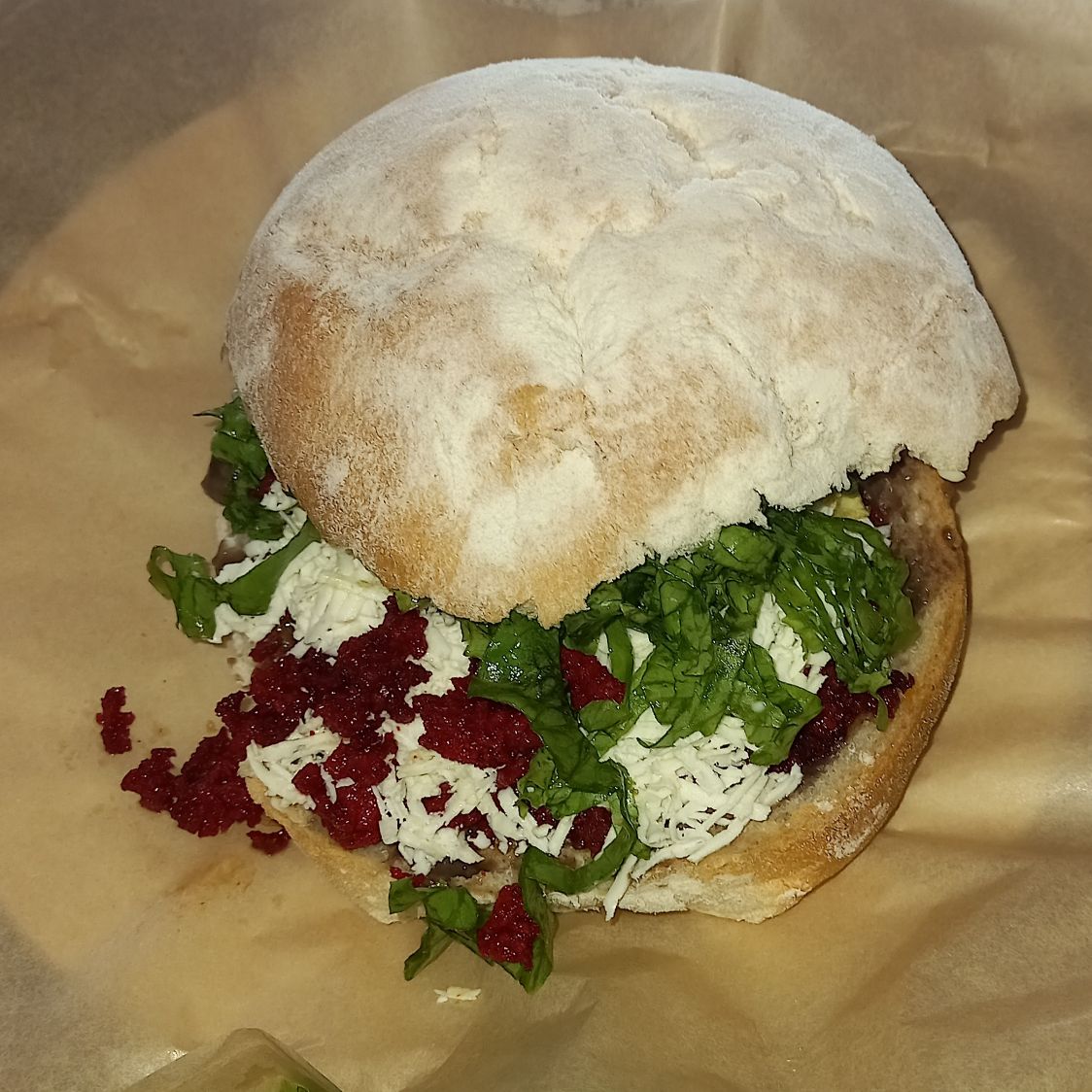 Base de frijol, milanesa de cerdo, lechuga, tomate, aguacate, queso de cabra.