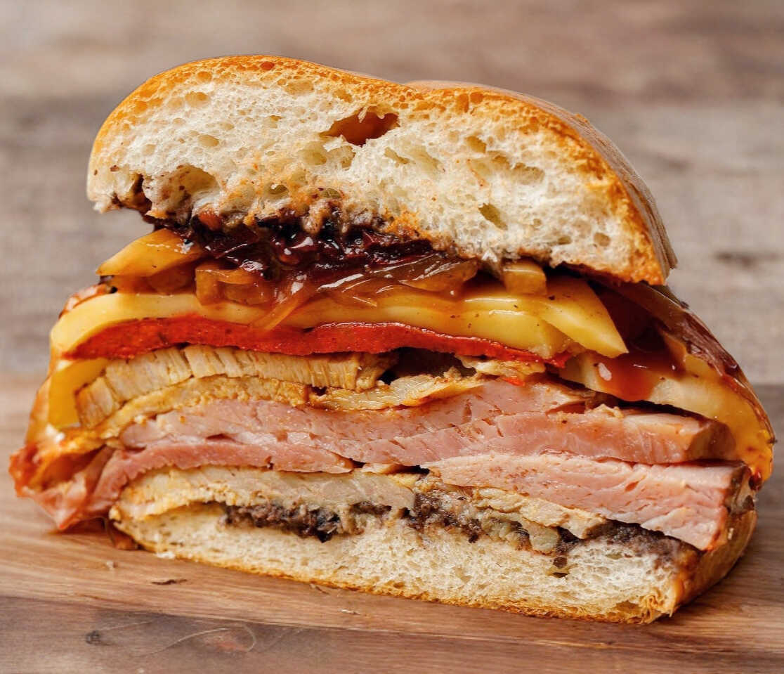 Torta de chorizo, jamón, pierna y queso en pan artesanal con frijol, cebolla, chipotle y salsa de tomate preparada.