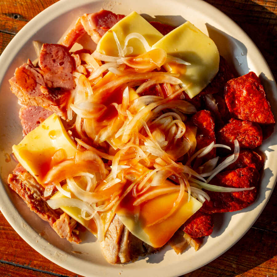 Selección de jamón envinado, pierna, queso gouda y chorizo.