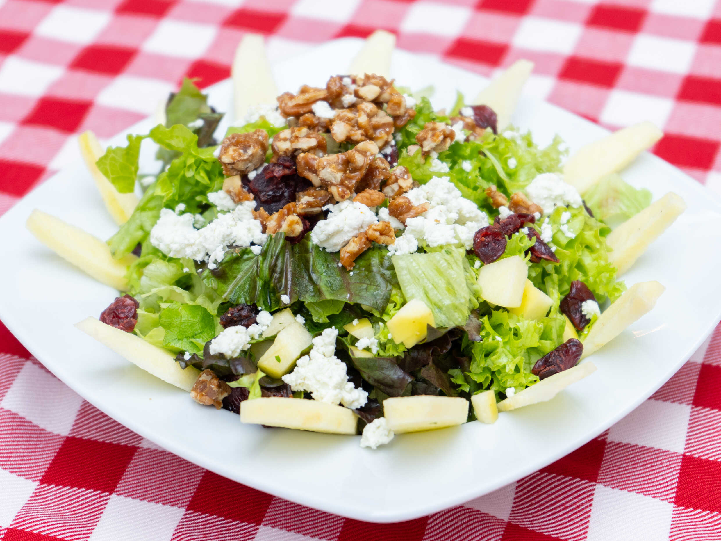 Mezcla de lechugas vinagreta italiana con manzana verde arándanos deshidratados nuez caramelizada y queso de cabra
