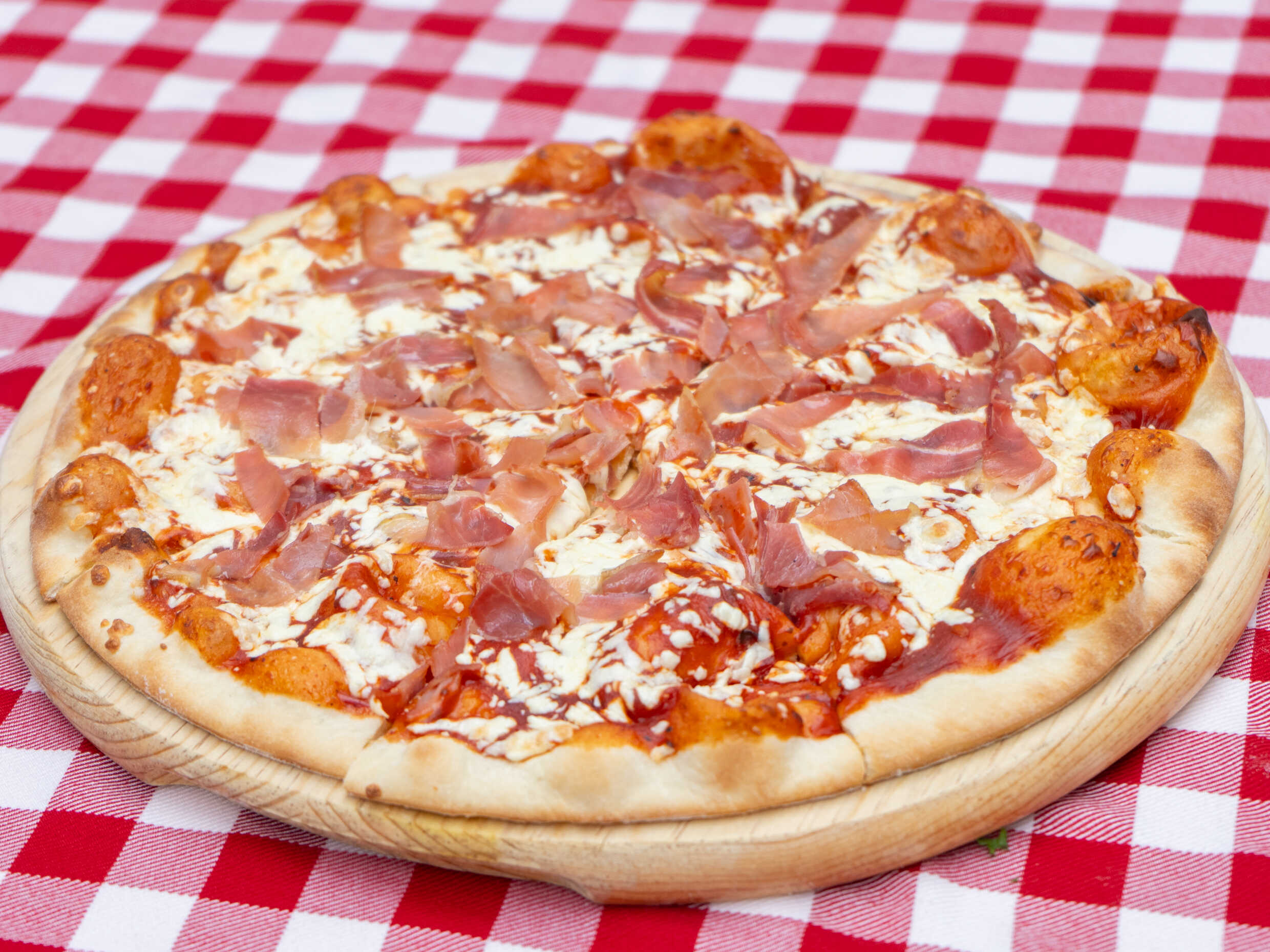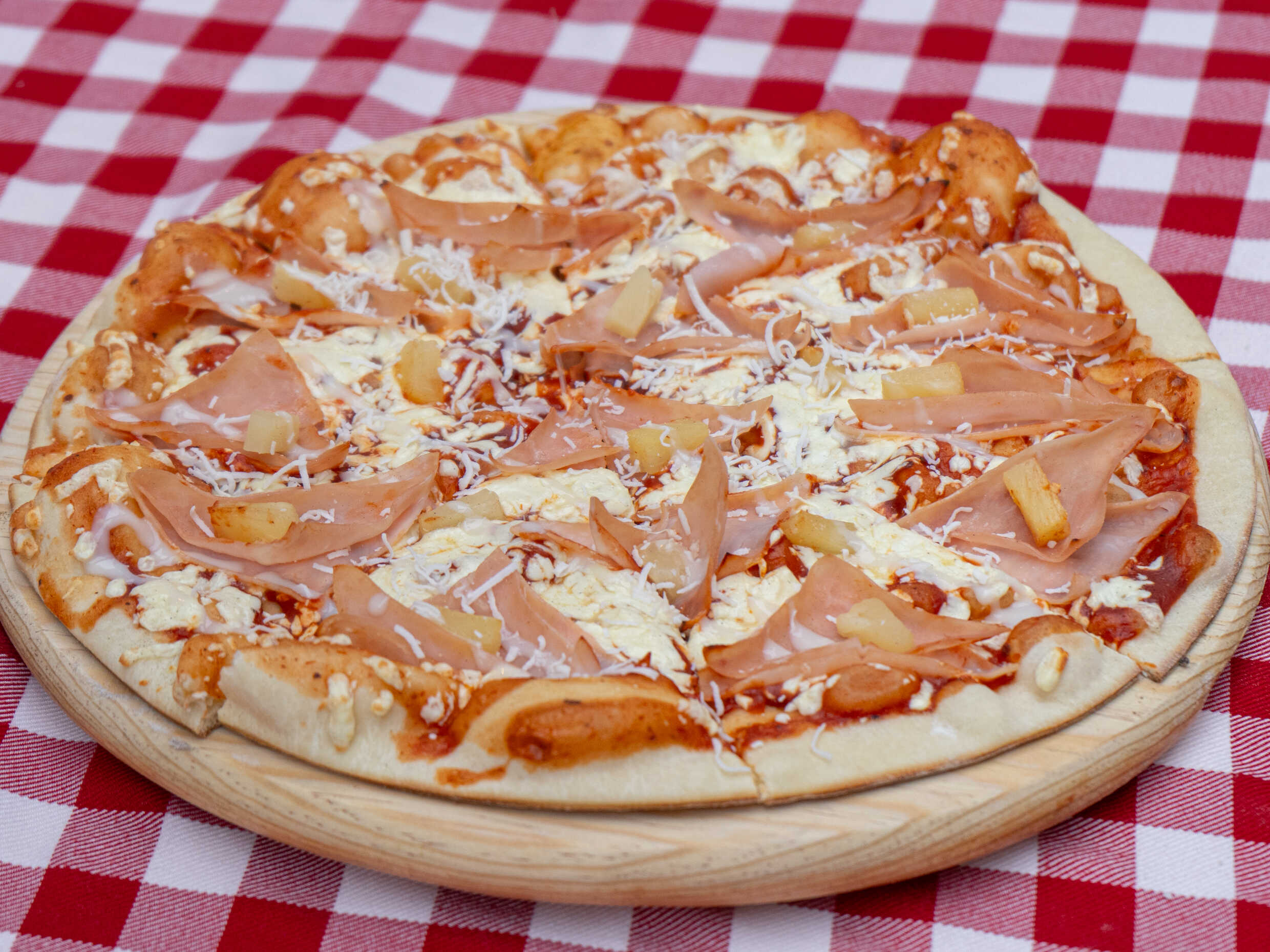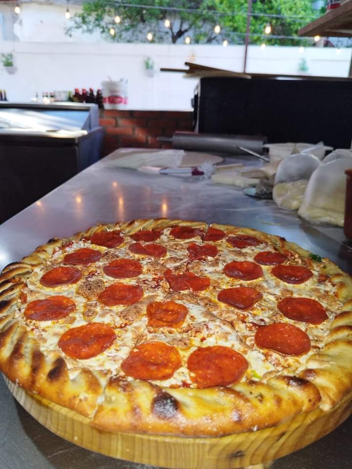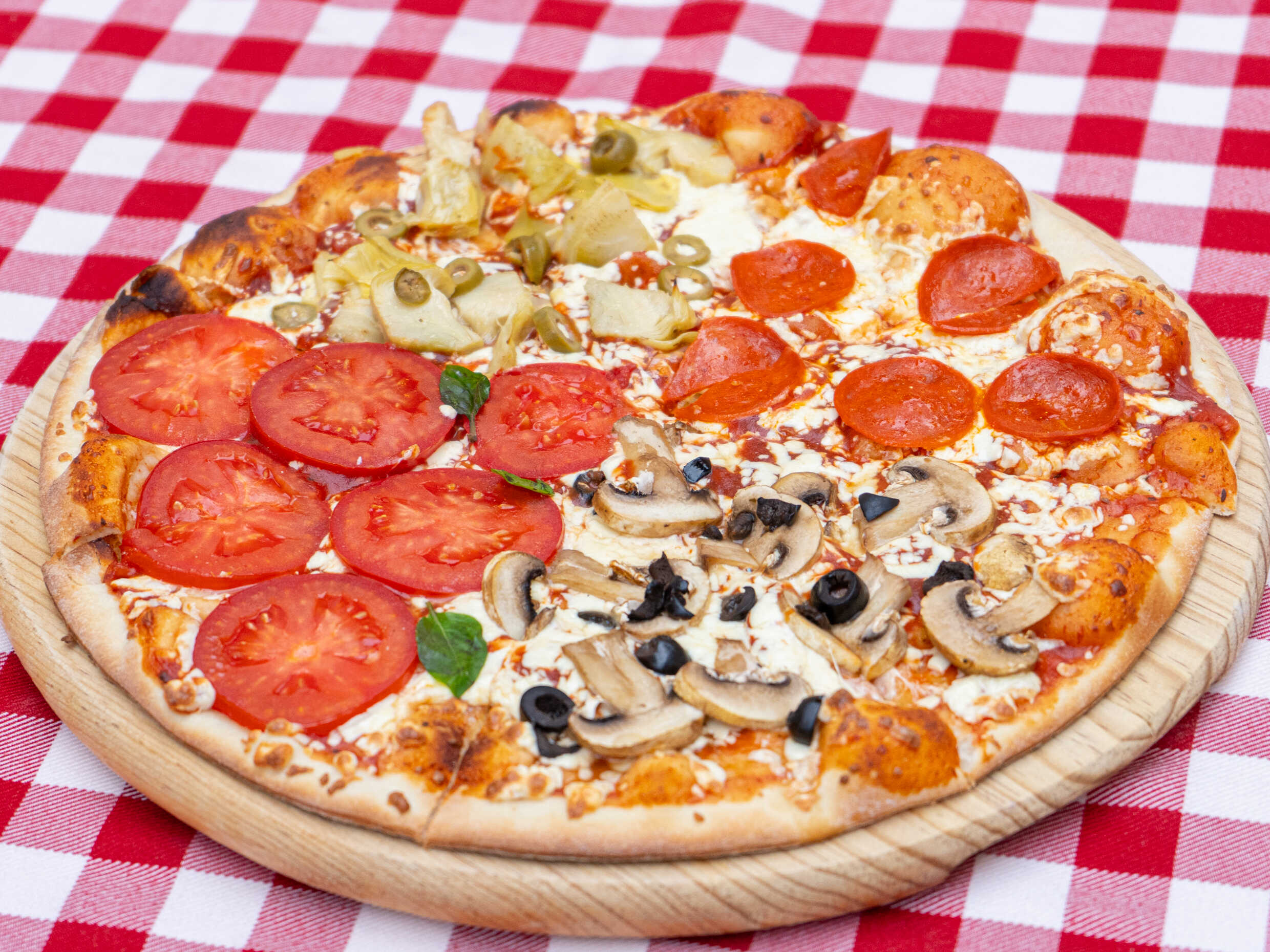 Alcachofas, tomate, albahaca, champiñones, pepperoni, aceitunas y queso base de la casa.