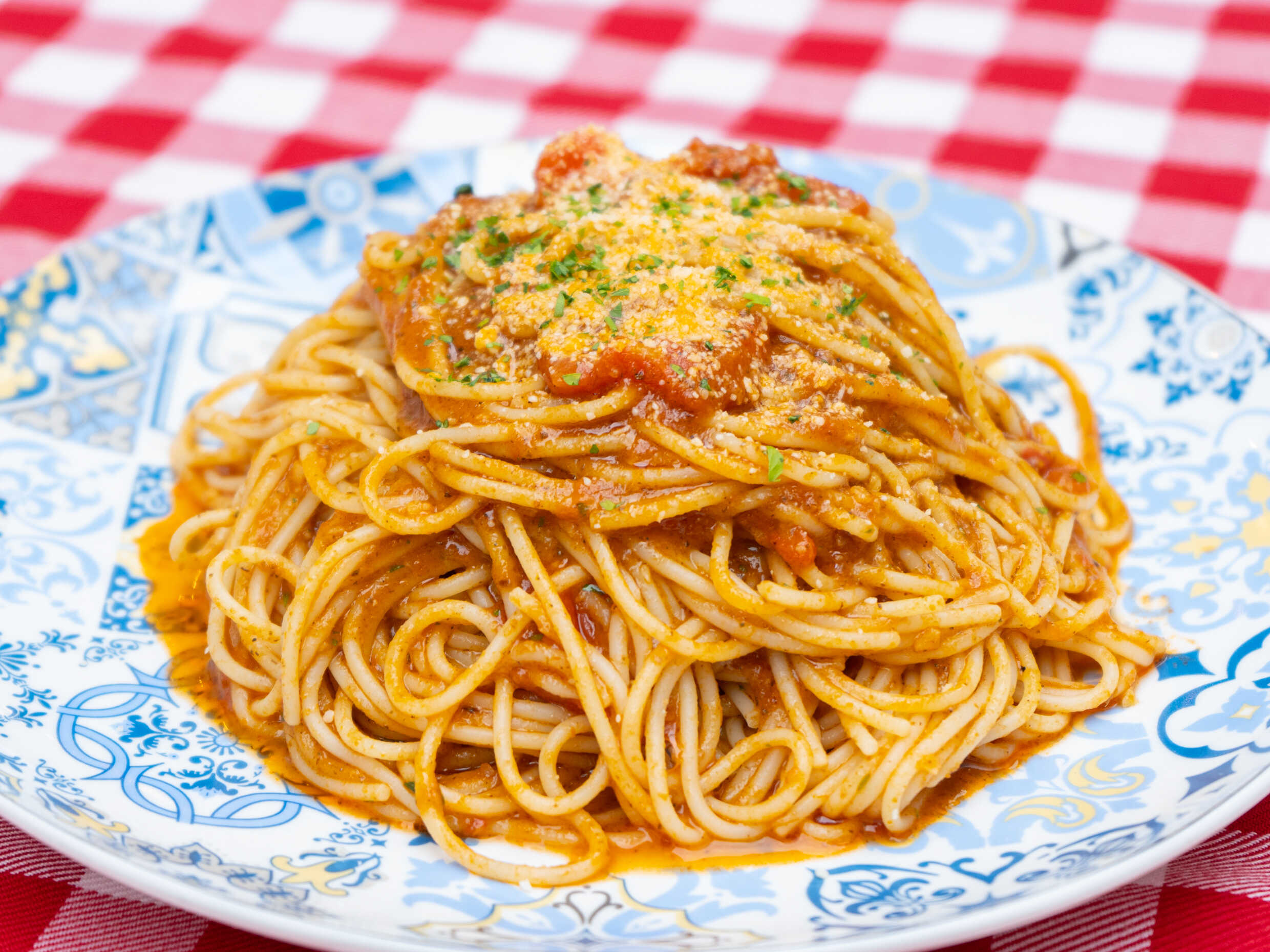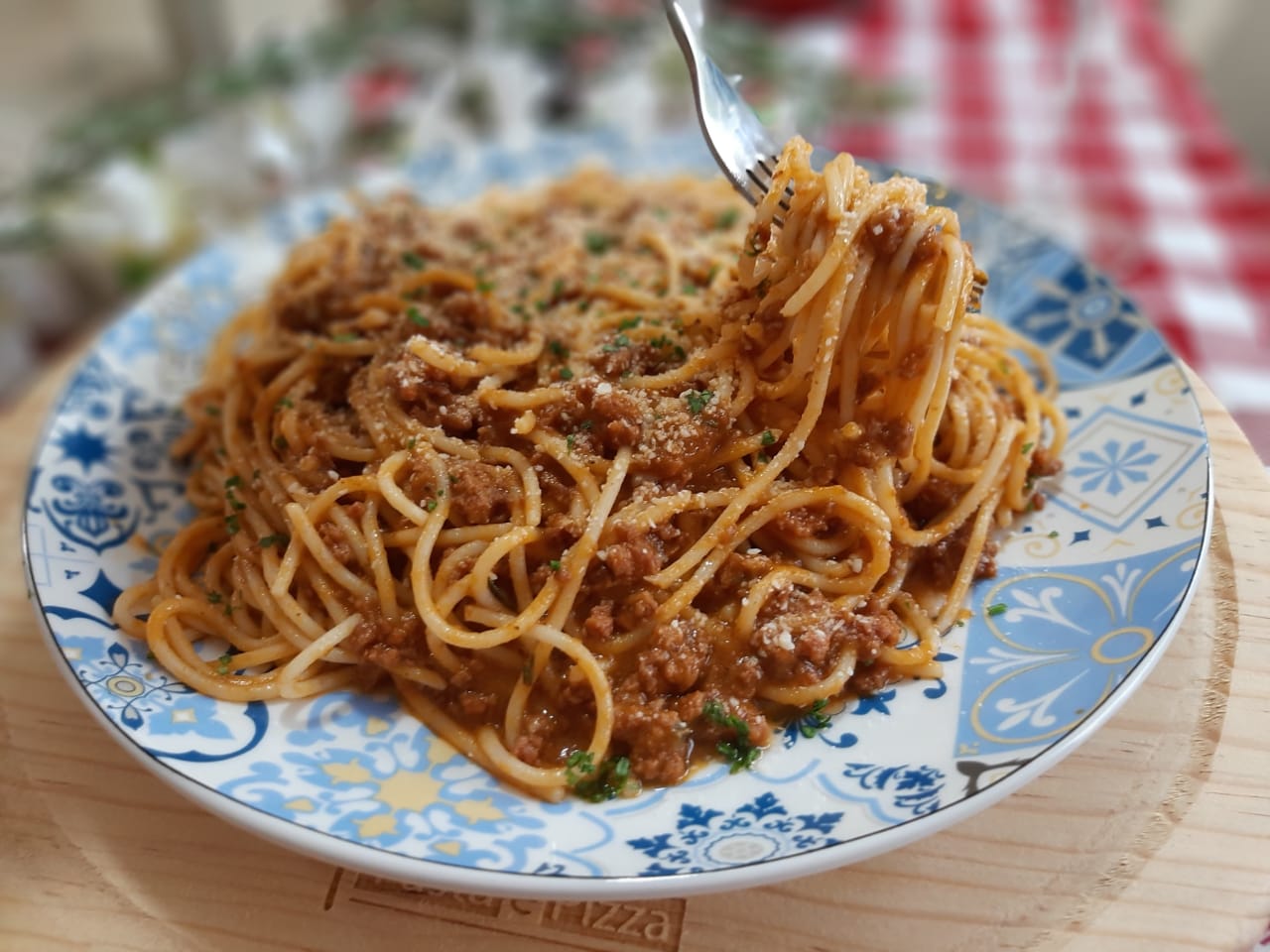 Carne molida, salsa de tomate, aceite de oliva, orégano, pimienta y queso parmesano rallado.