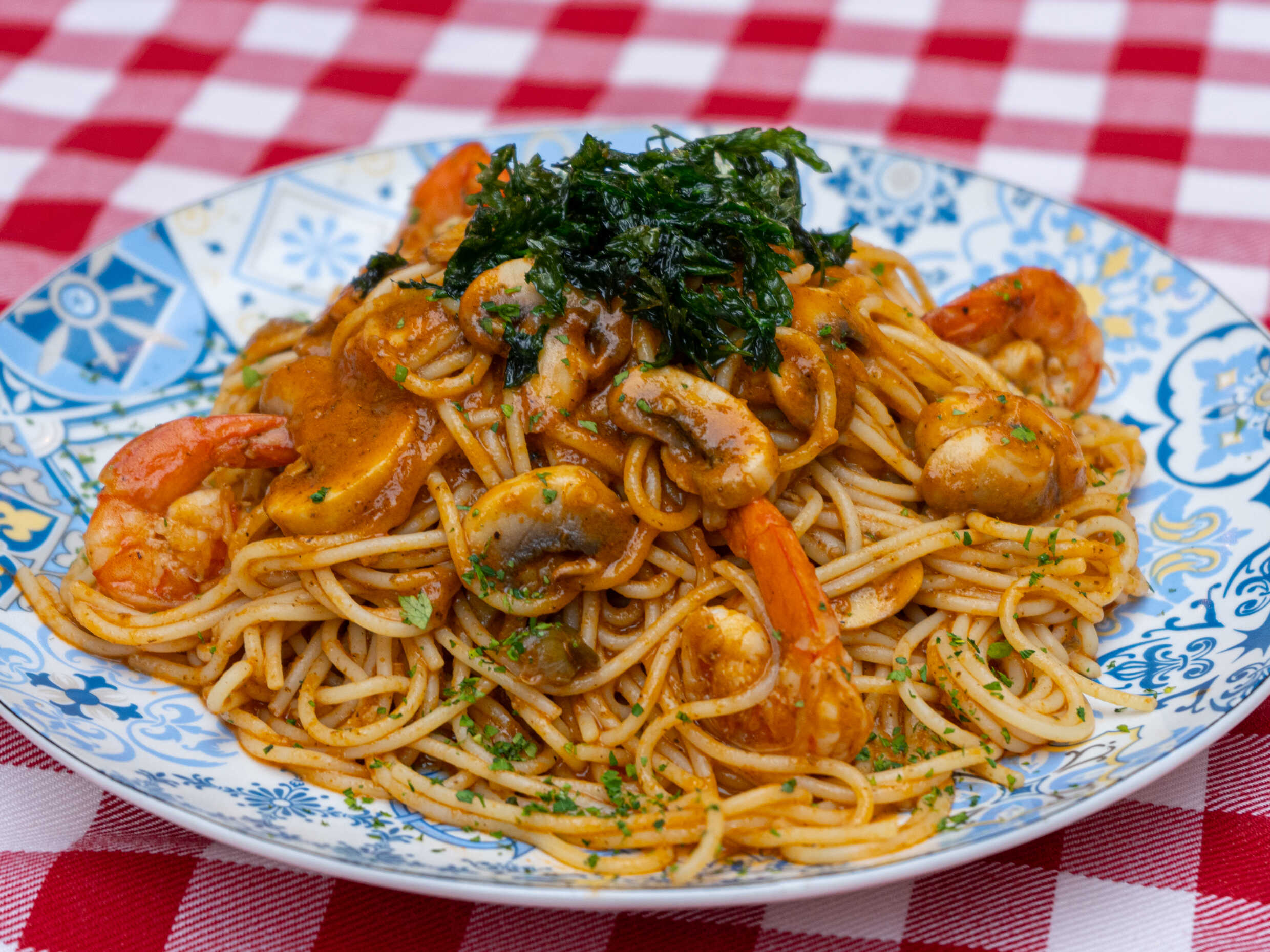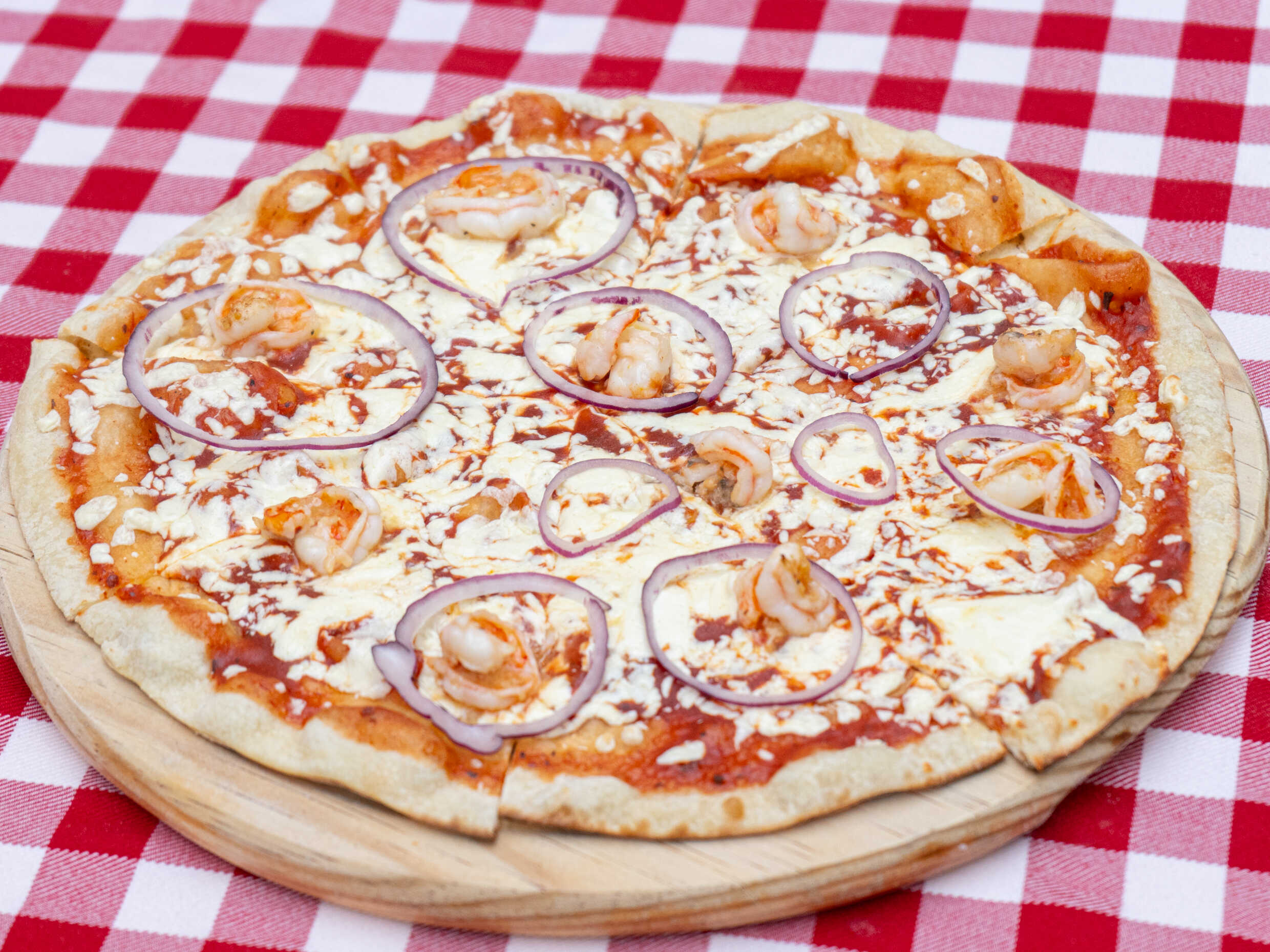 Aceite de olivo, tomate, champiñones, alcaparras y camarones.