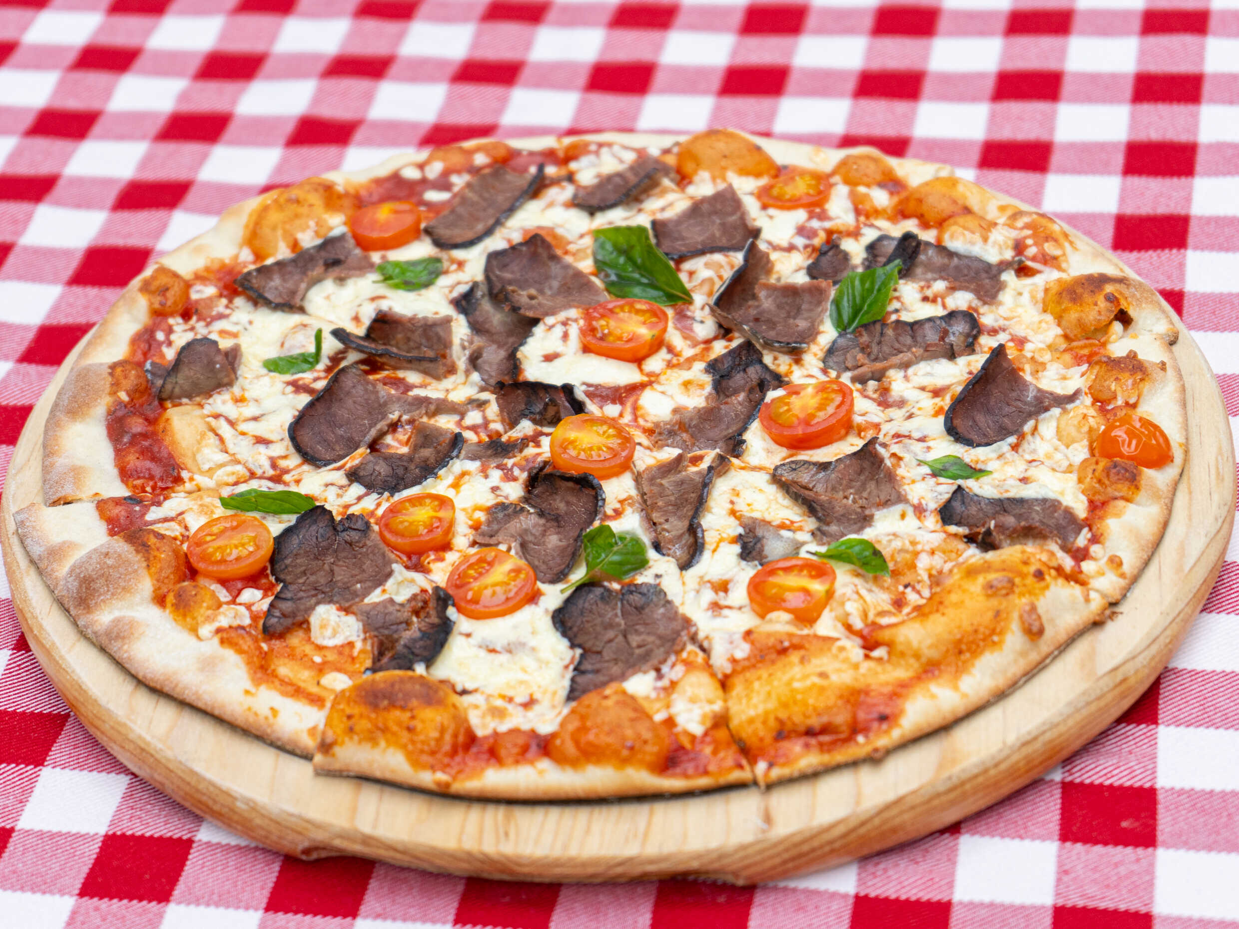 Roast beef, salsa pomodoro, queso base de la casa, albahaca y tomate cherry.
