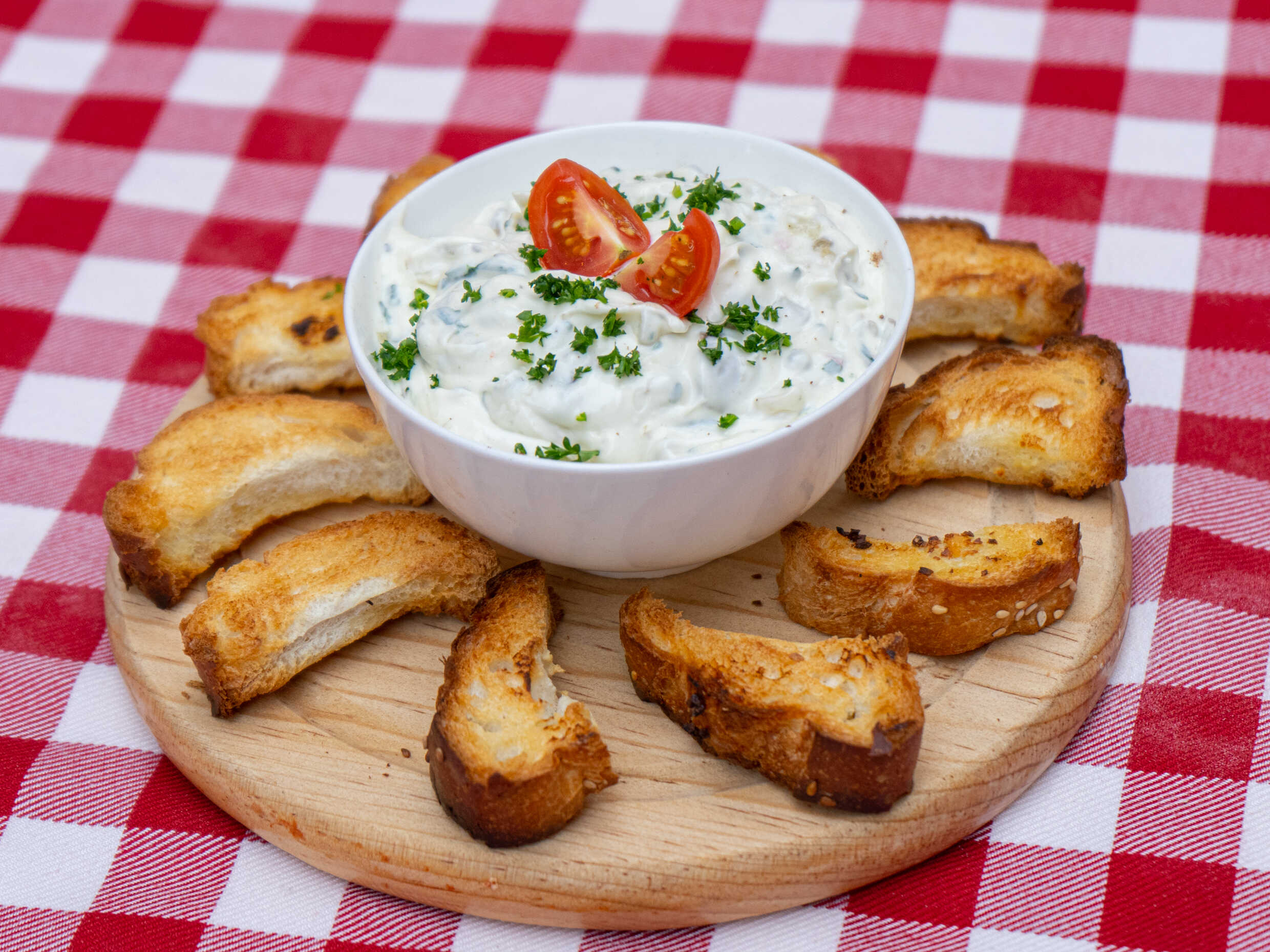 Tradicional pan tostado con mantequilla de hierbas acompañado con queso parmesano y perejil