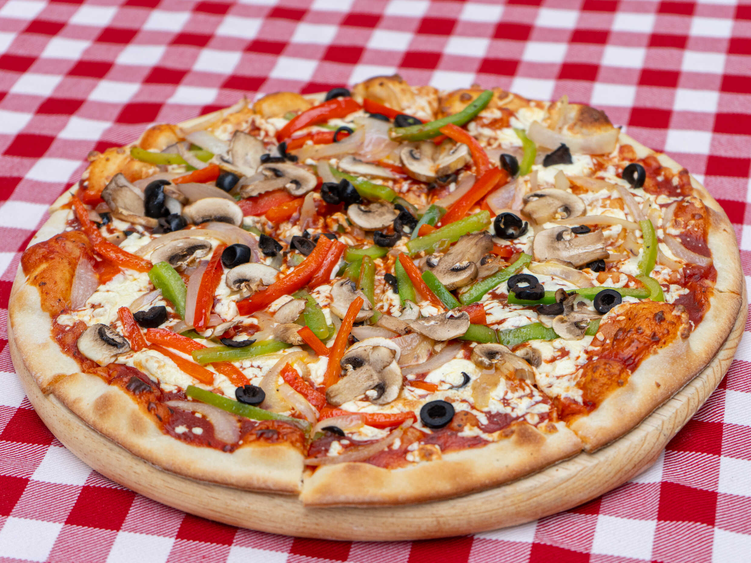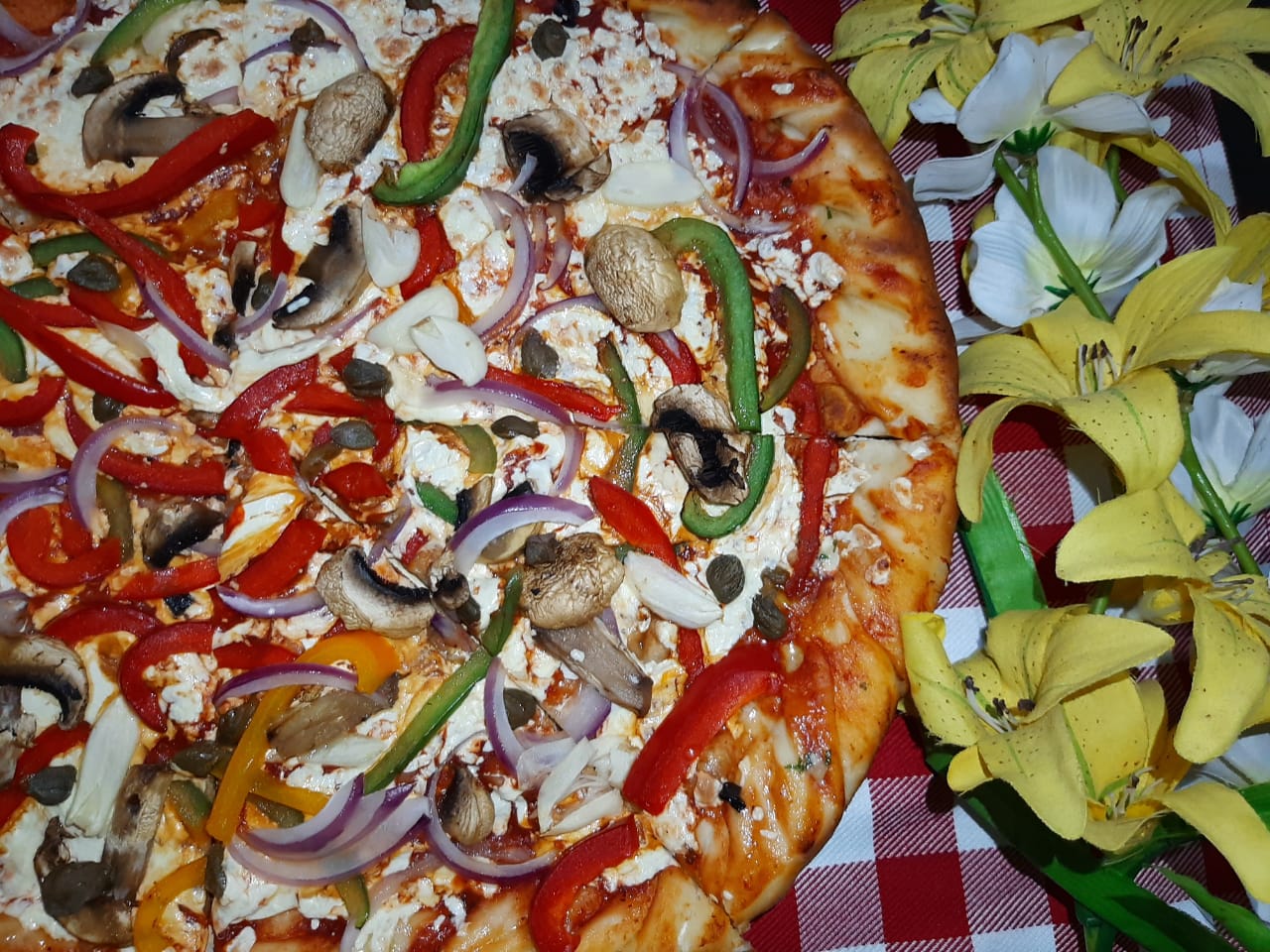 Champiñón, pimiento, cebolla, tomate, aceitunas negras y queso base de la casa.