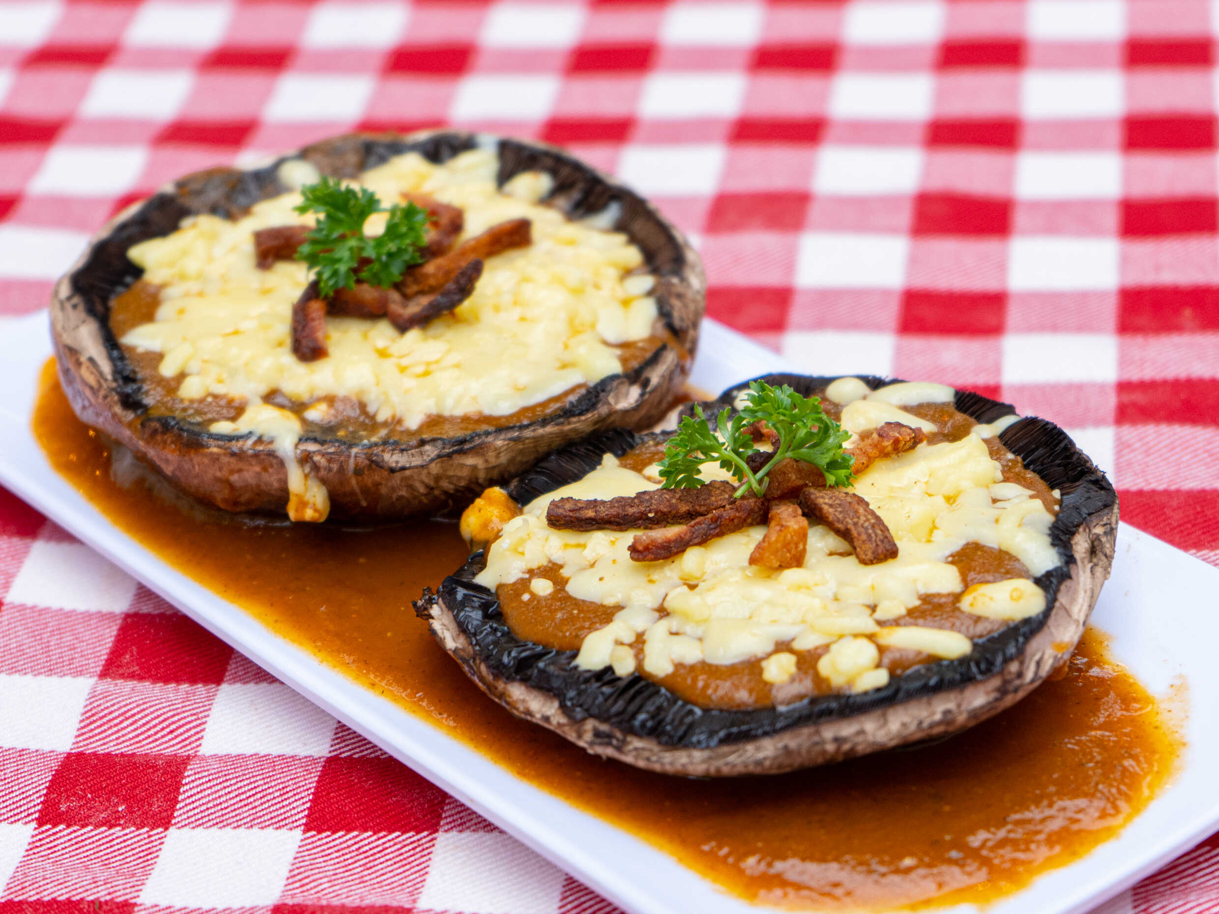 Hongos portobello rellenos de queso mozzarella con trozos de tocino crujiente en un espejo de salsa pomodoro