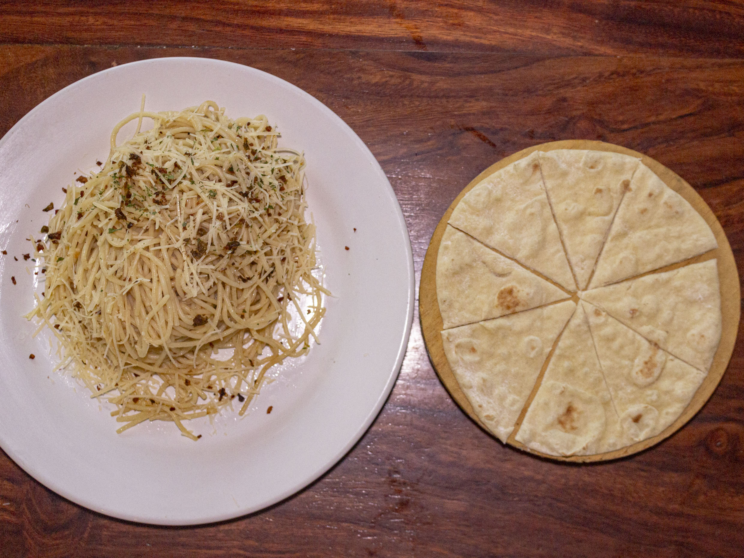 Aceite de olivo, ajo, tocino, tomate albahaca, queso parmesano y peperoncino.