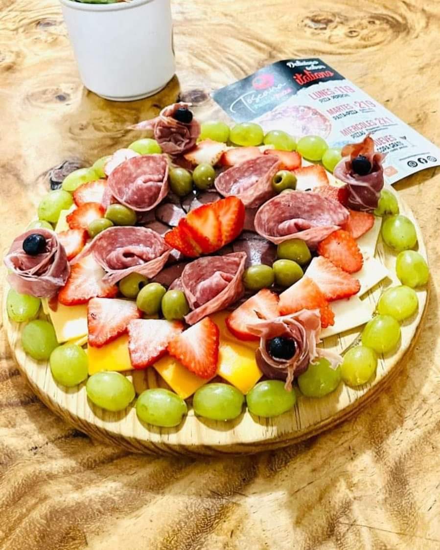 Salami, jamón Serrano, roast beff, queso suizo, queso gouda y queso haverti, verdes y frutos rojos
