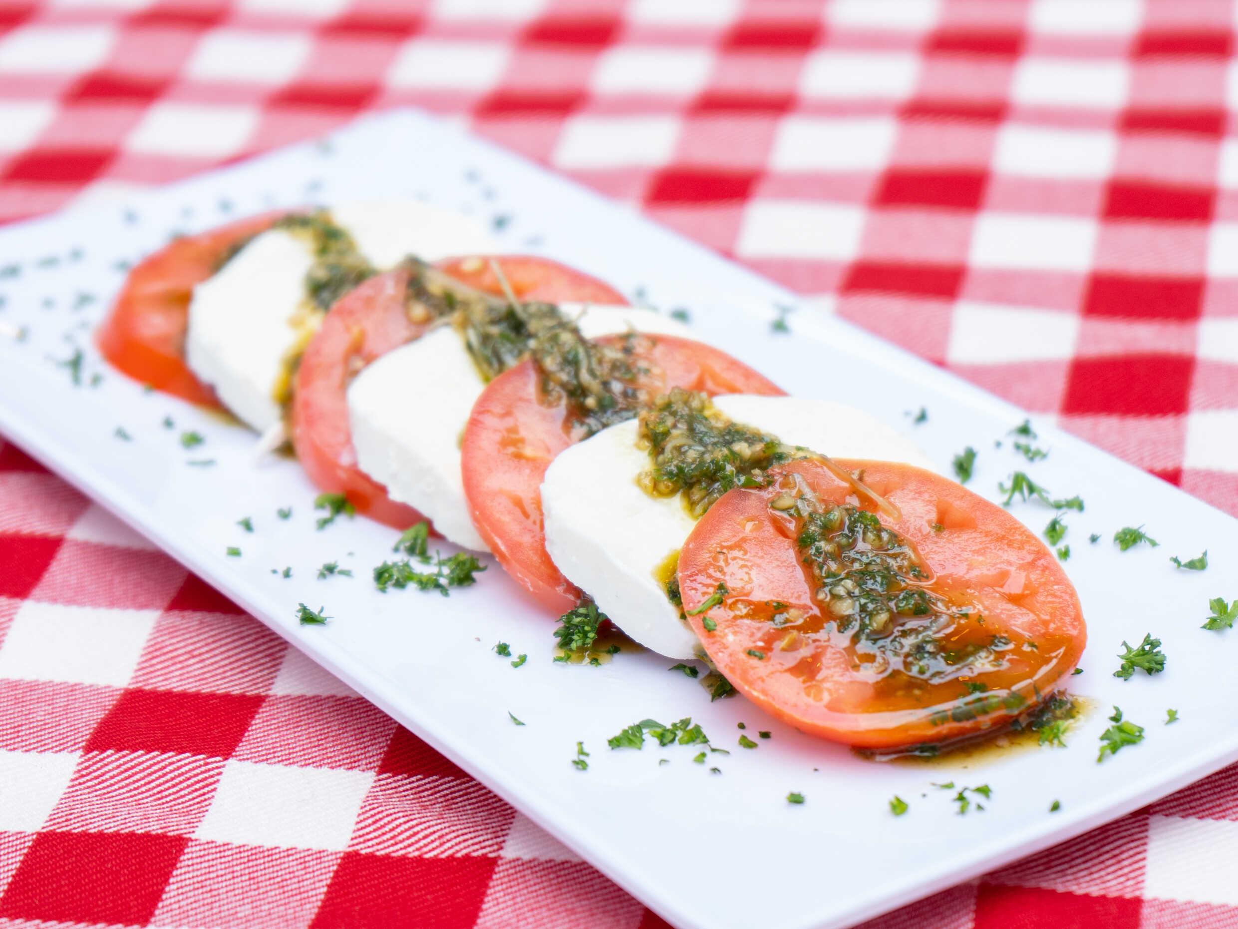 Rebanadas de jitomate marinadas en vinagreta y aceite de oliva intercaladas con queso mozzarella y albahaca