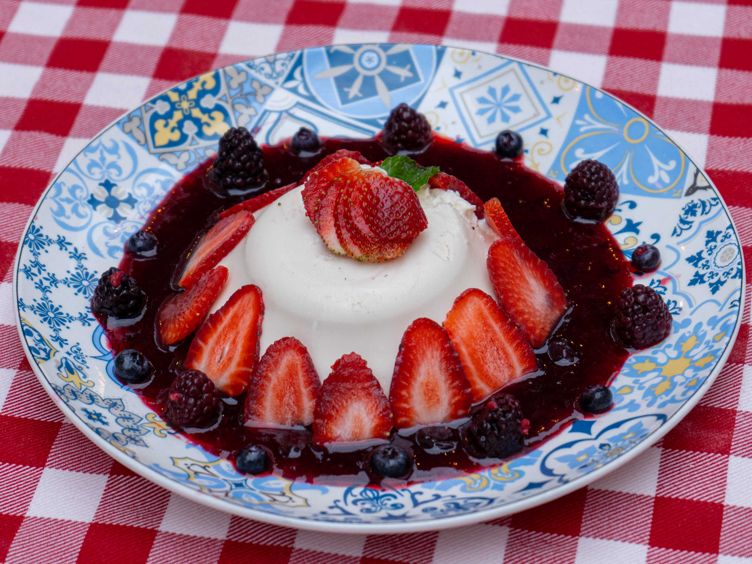 Gelificación cremosa con licor de amaretto sobre un espejo de frutos rojos.