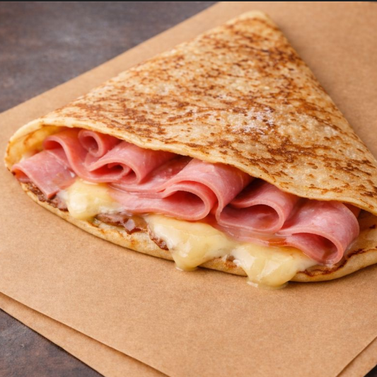 Crepa dorada al momento, rellena con queso manchego, philadelphia fundido y laminas de jamón, logrando una combinación suave, cremosa y llena de sabor