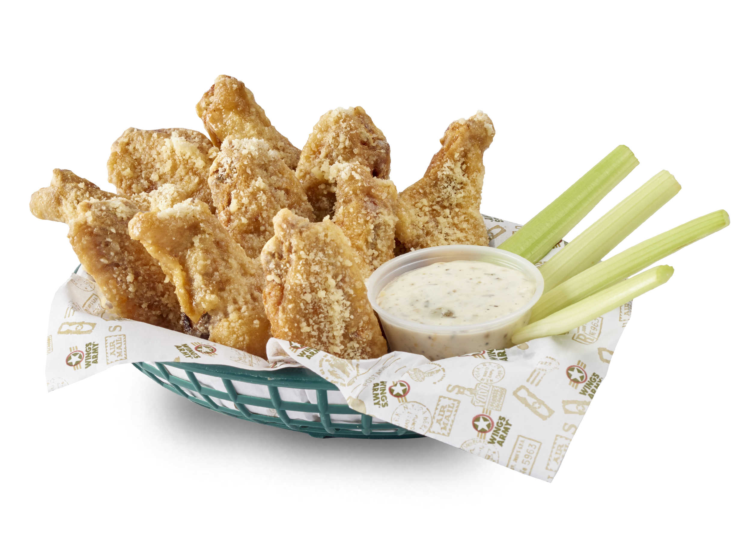 Alitas con 2 salsas a elección, 6 dedos de queso o 6 aros de cebolla, vegetales, dip a elección.