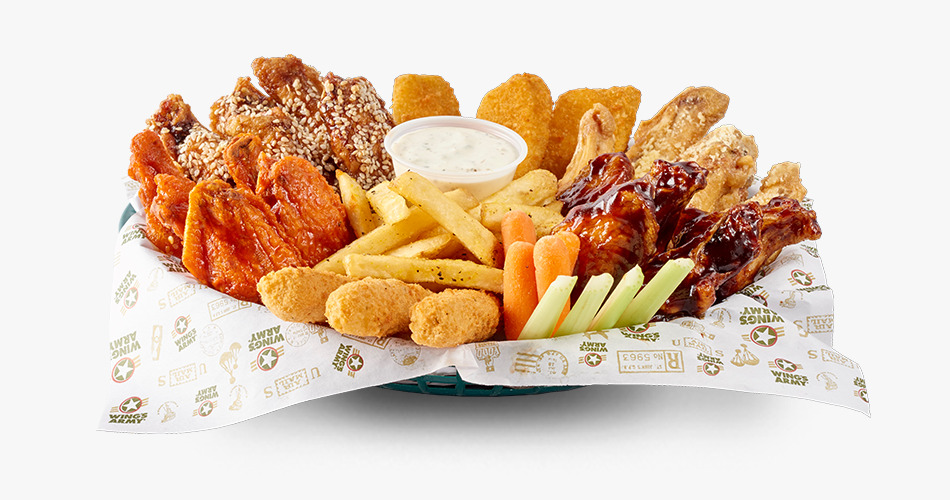 Alitas con 5 salsas a elección, 6 dedos de queso, 6 churros de cebolla, papas, aros de cebolla, vegetales y 2 dip a elección.