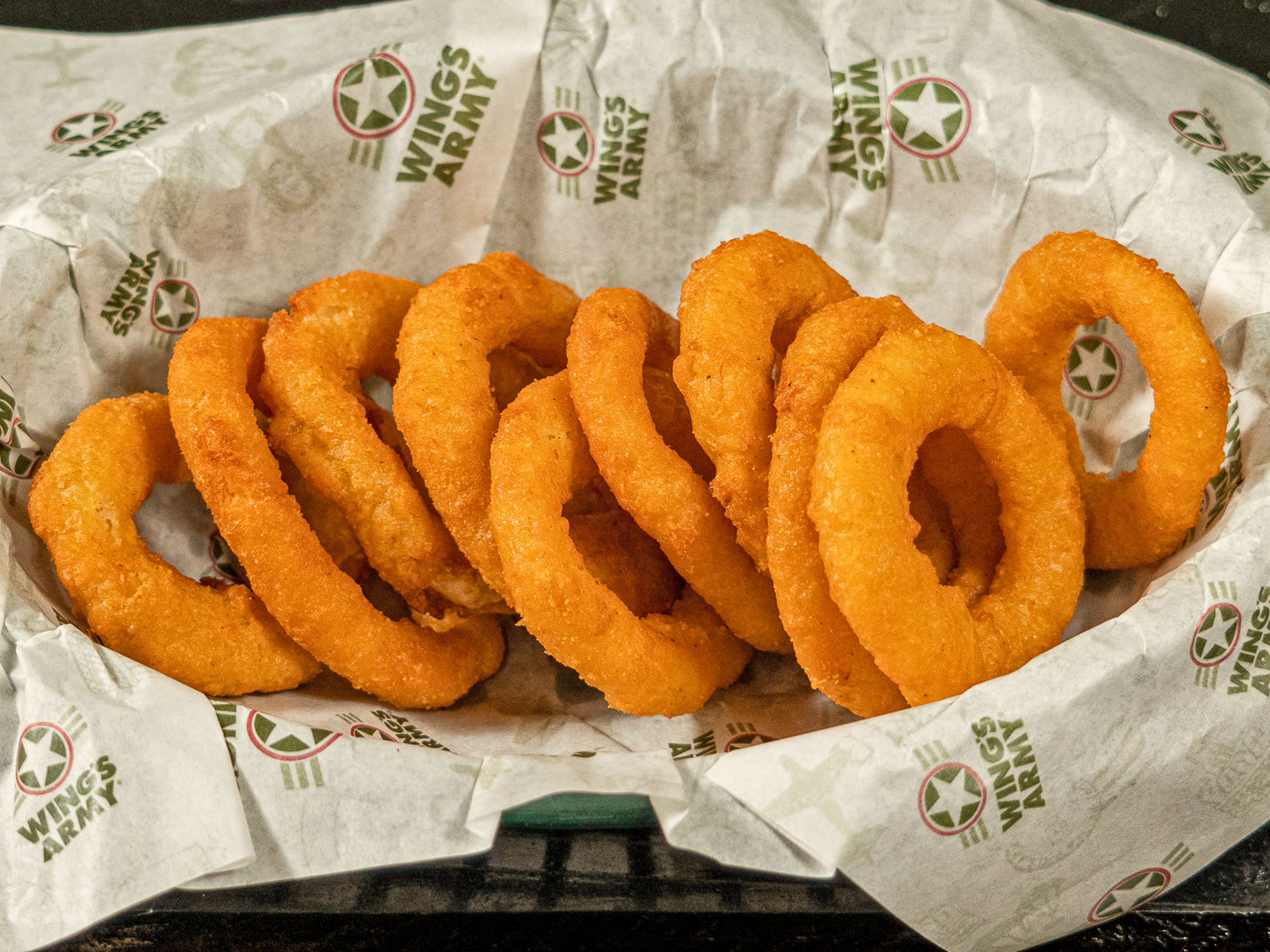 10 Crujientes aros de cebolla empanizados y sazonados al estilo de la casa.