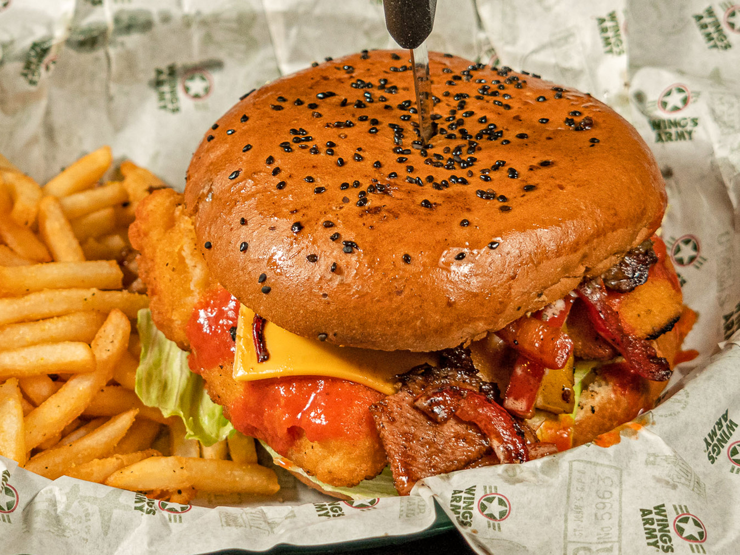 Pechuga de pollo empanizado, cebolla, jitomate, tocino, pimiento morrón rojo y amarillo, lechuga, ranch y queso amarillo. 150 Gr. de pechuga de pollo empanizado y 130 gr. de papas de la casa.