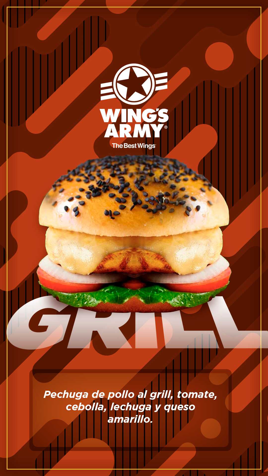 Pechuga de pollo al grill, cebolla, jitomate, lechuga y queso amarillo. 150 Gr. de pechuga de pollo y 130 gr. de papas de la casa.