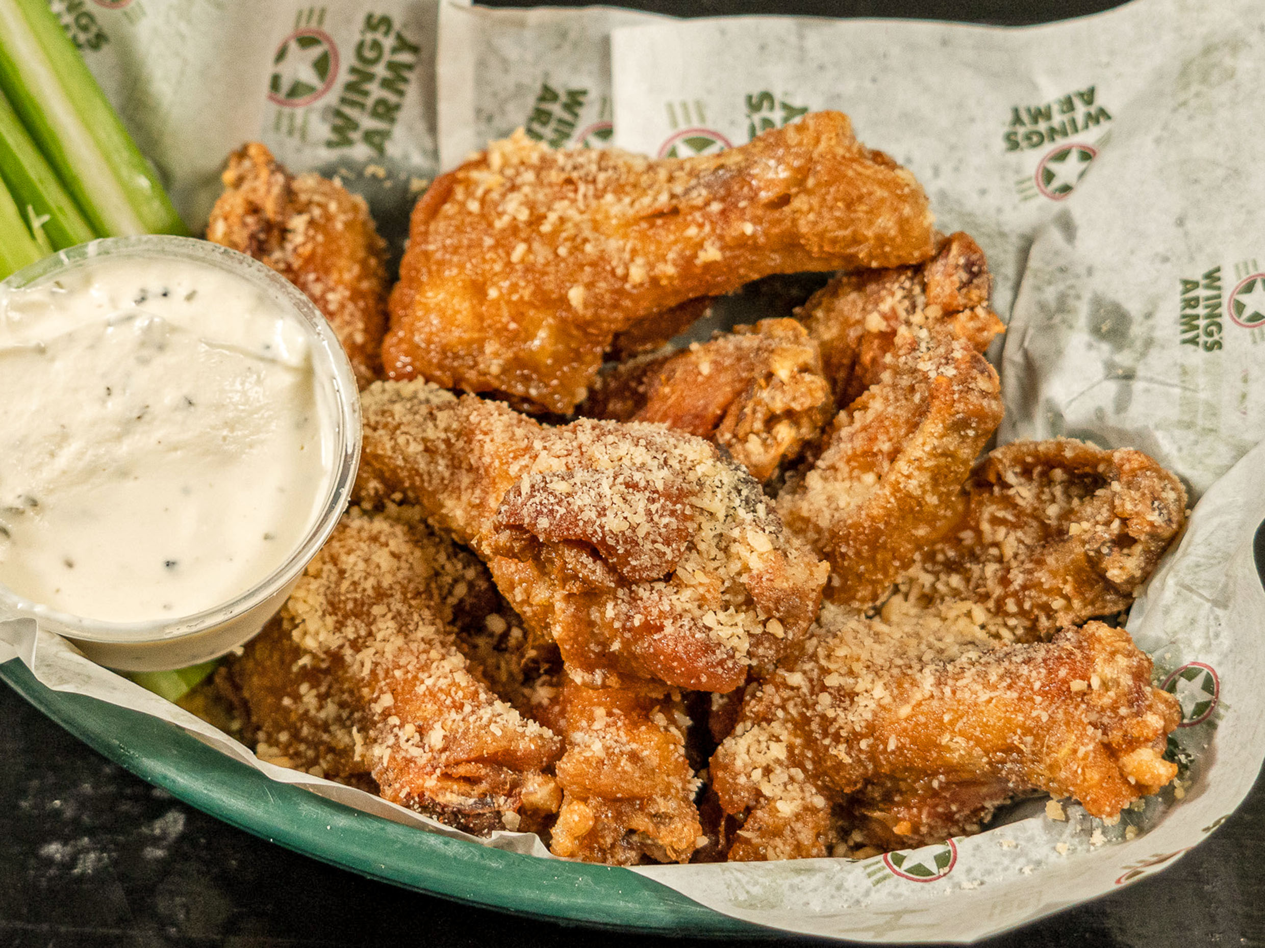 1.5 de alitas , 1 orden de papas o 10 aros de cebolla , vegetales y 2 dips chicos ranch o bluechesse.
