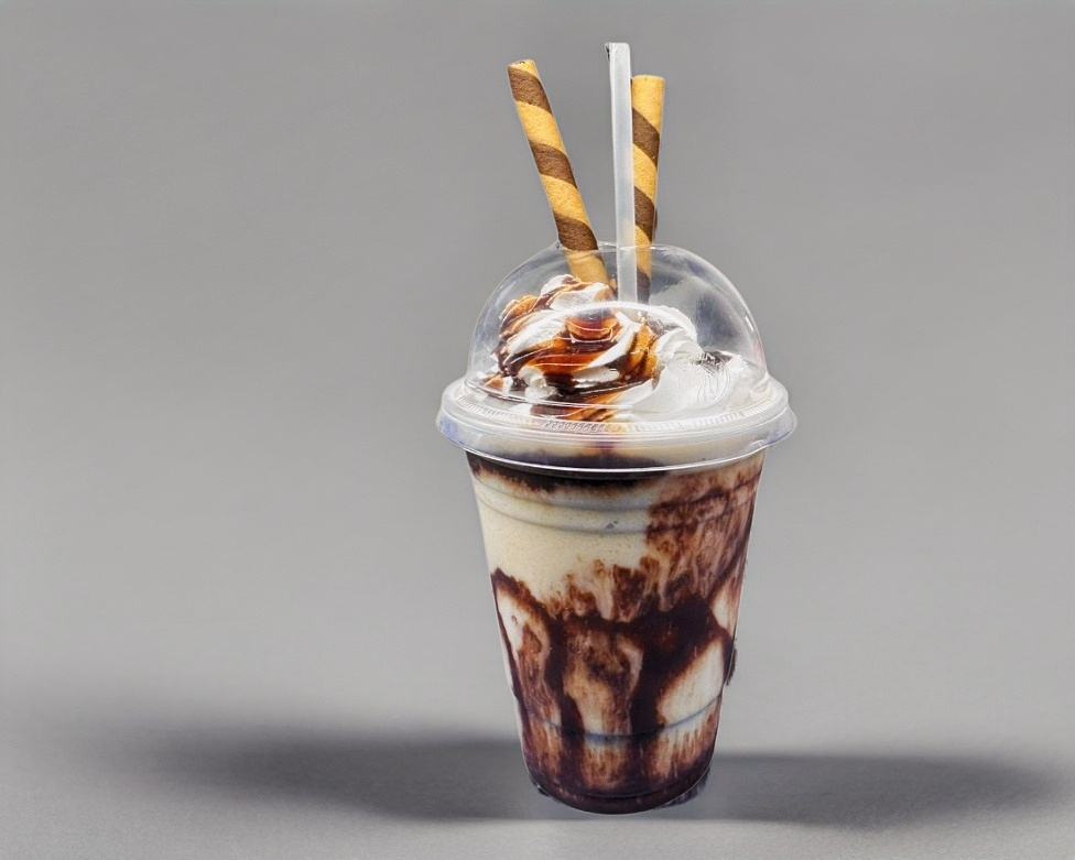 Bebida frappeada con leche y café expreso, decorado con crema batida y hershey's