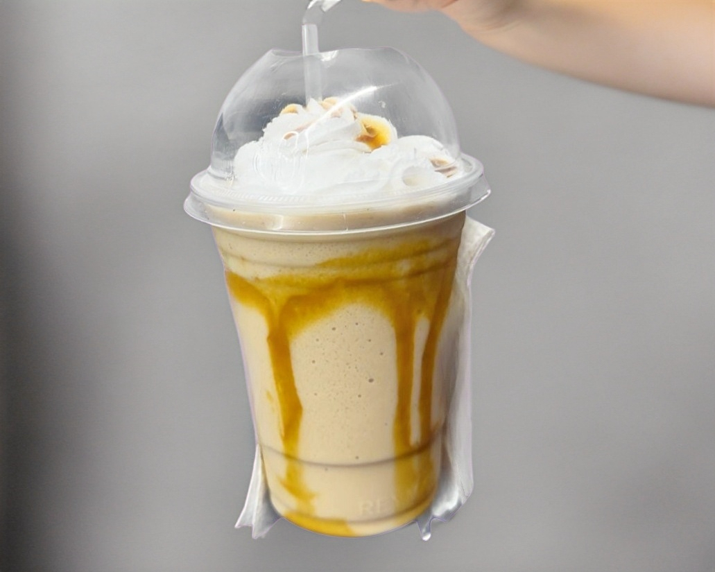 Bebida frappeada a base de leche sabor mazapán, decorado con crema batida y hershey's