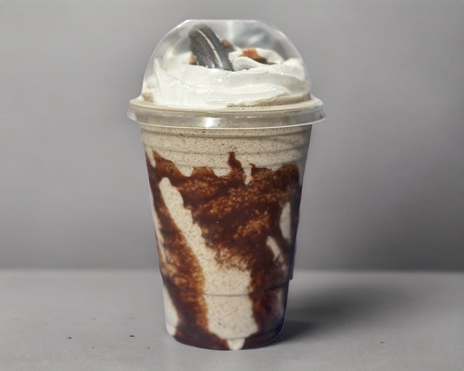 Bebida frappeada a base de leche sabor galleta óreo, decorado con crema batida y hershey's