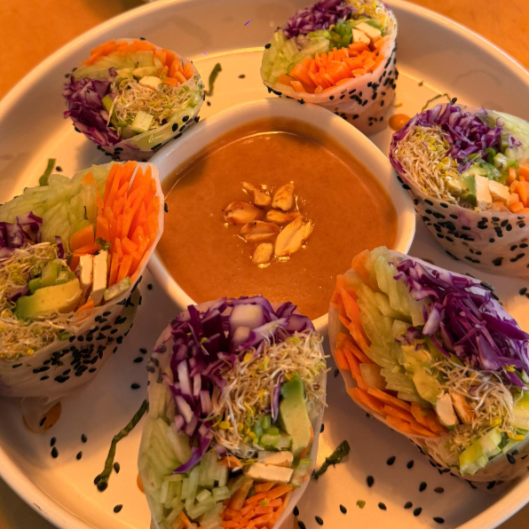 Los clásicos rollitos con pepino, zanahoria, hierbabuena, germinado, col morada, cebollín, tofu y ajonjolí negro, todo esto envuelto en una fina hoja de arroz. Acompañados de su deliciosa salsa asiática de cacahuate.