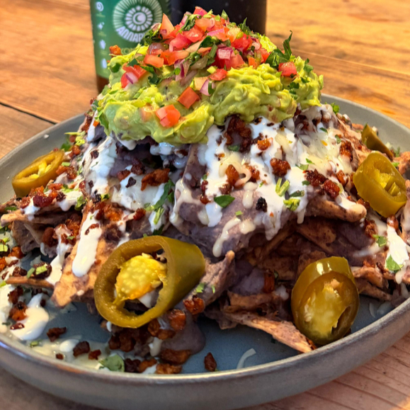 Base de totopos horneados con abundante queso gratinado, frijoles refritos con chorizo, guacamole con pico de gallo y una generosa porción de jalapeños.