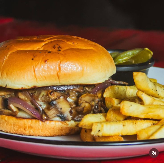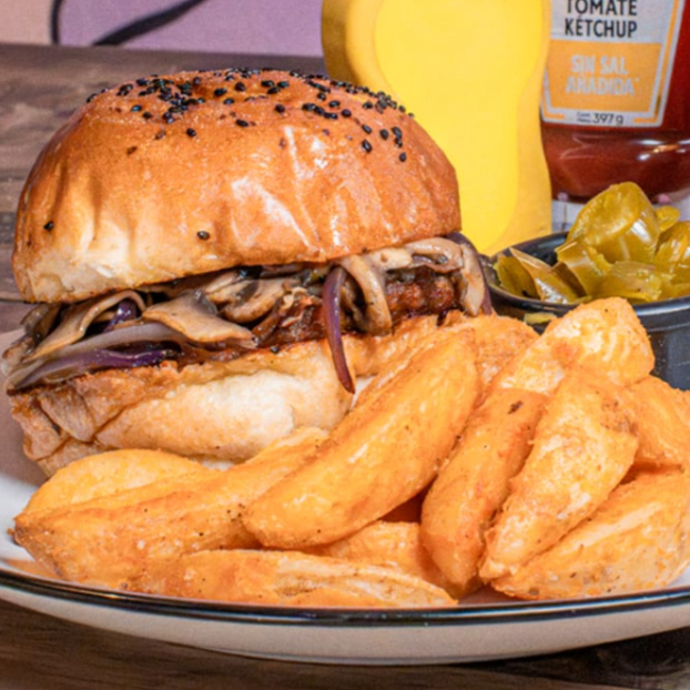 Hecha con Beyond Meat, champiñones y cebolla caramelizada, con queso americano derretido y nuestro aderezo especial de la casa. Acompañada de papas a la francesa, gajo o crisscut.
