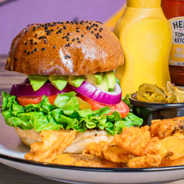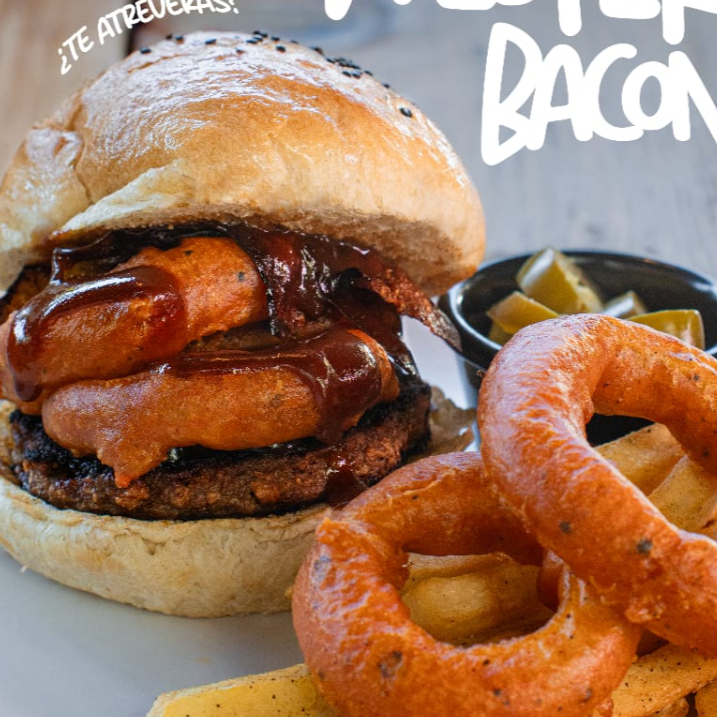 Deliciosa hamburguesa estilo texano con Beyond Meat, montada con tocino vegano, aros de cebolla, queso americano, BBQ y un toque exquisito de nuestro aderezo especial de la casa. Acompañada de papas a la francesa, gajo o crisscut.