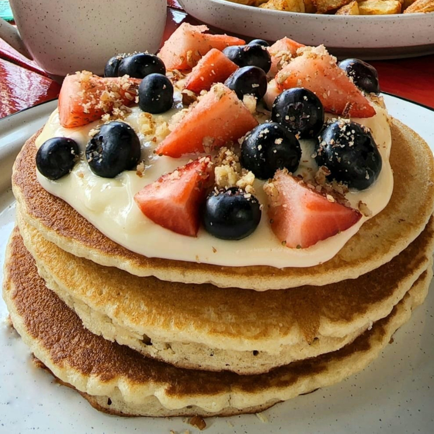 Deliciosos pancakes de harina de trigo y avena con zarzamoras y fresas, acompañados de rebanadas de plátano, manzana, nuez y mermelada de fresa o miel.
