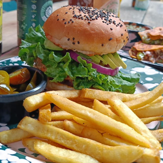 Deliciosa hamburguesa montada con Beyond Meat, lechuga, tomate, cebolla, aguacate, queso americano, pepinillos y aderezo de la casa. Acompañada de papas a la francesa, gajo o crisscut.