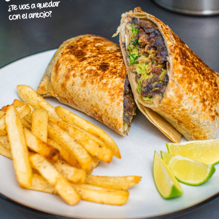 Tortilla de harina gigante, con su base de frijoles refritos, queso cheddar, una cama de lechuga, guacamole de la casa y pico de gallo. Servido con papas a la francesa.