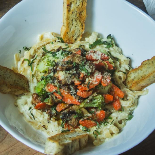 Riquísima pasta en salsa Alfredo hecha en casa, champiñones, zanahoria y brócoli. Acompañada con pan de centeno con ajo, aceite de oliva y orégano.