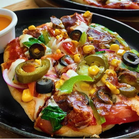 Con masa crujiente, condimentada hecha en casa, salsa de tomate especial y queso vegano. Escoge tus ingredientes: champiñones, jalapeños, piña, aceitunas, tomate, espinacas, cebolla morada, pimientos y elote.