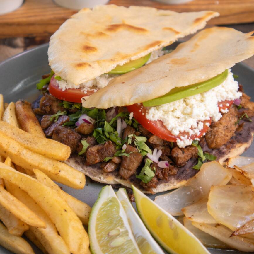 Con pan pita de la casa, aguacate, queso cheddar, frijoles refritos, tomate, cebolla y cilantro. Acompañada de papas a la francesa y cebollita asada.