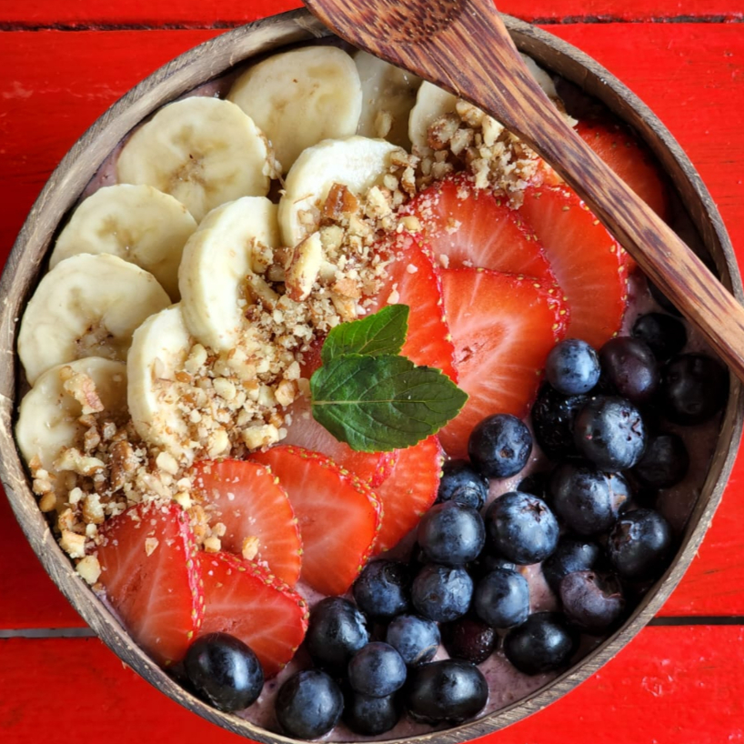 Mezcla de yogurth griego, chía activada, avena, crema de maní, plátano y blueberries. Coronado con plátano, nuez, fresas, blueberries y coco.