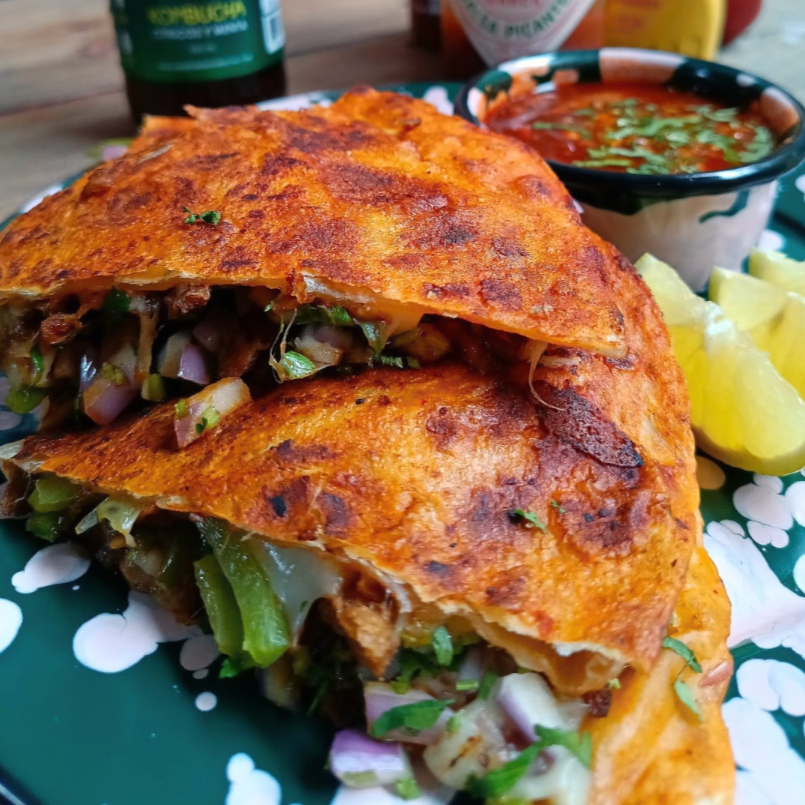 En tortilla de harina gigante con su quesito gratinado, birria con cebollita y chilito morrón a la plancha, acompañado de consomé.