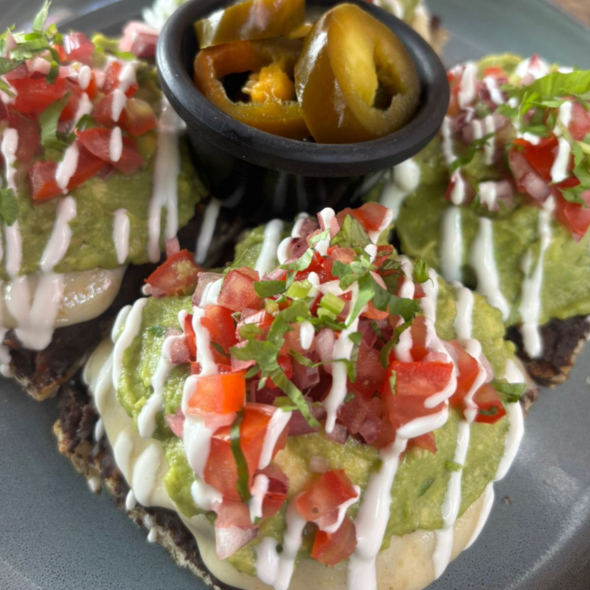 Deliciosos totopos recién hechos con salsa verde o roja, rebanadas de oro verde y por supuesto frijolitos negros. Agrega uno de nuestros guisos por $35