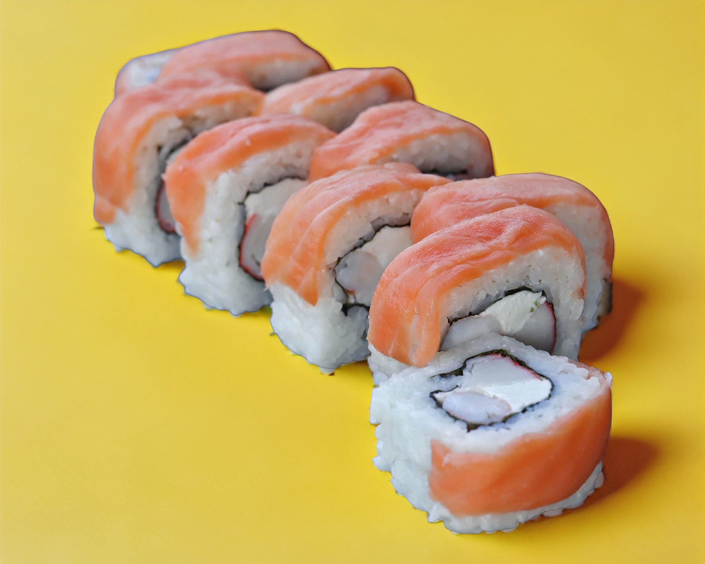 Salmón, queso crema y aguacate por dentro y salmón por fuera.