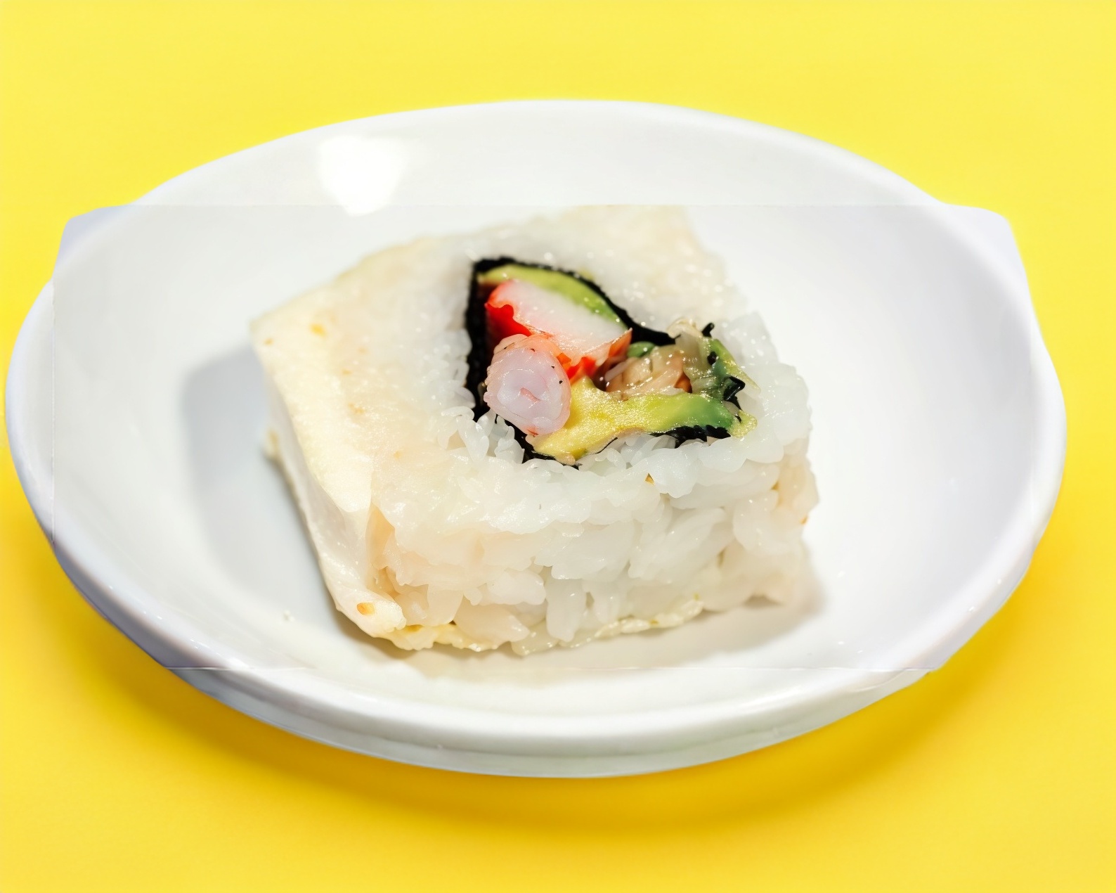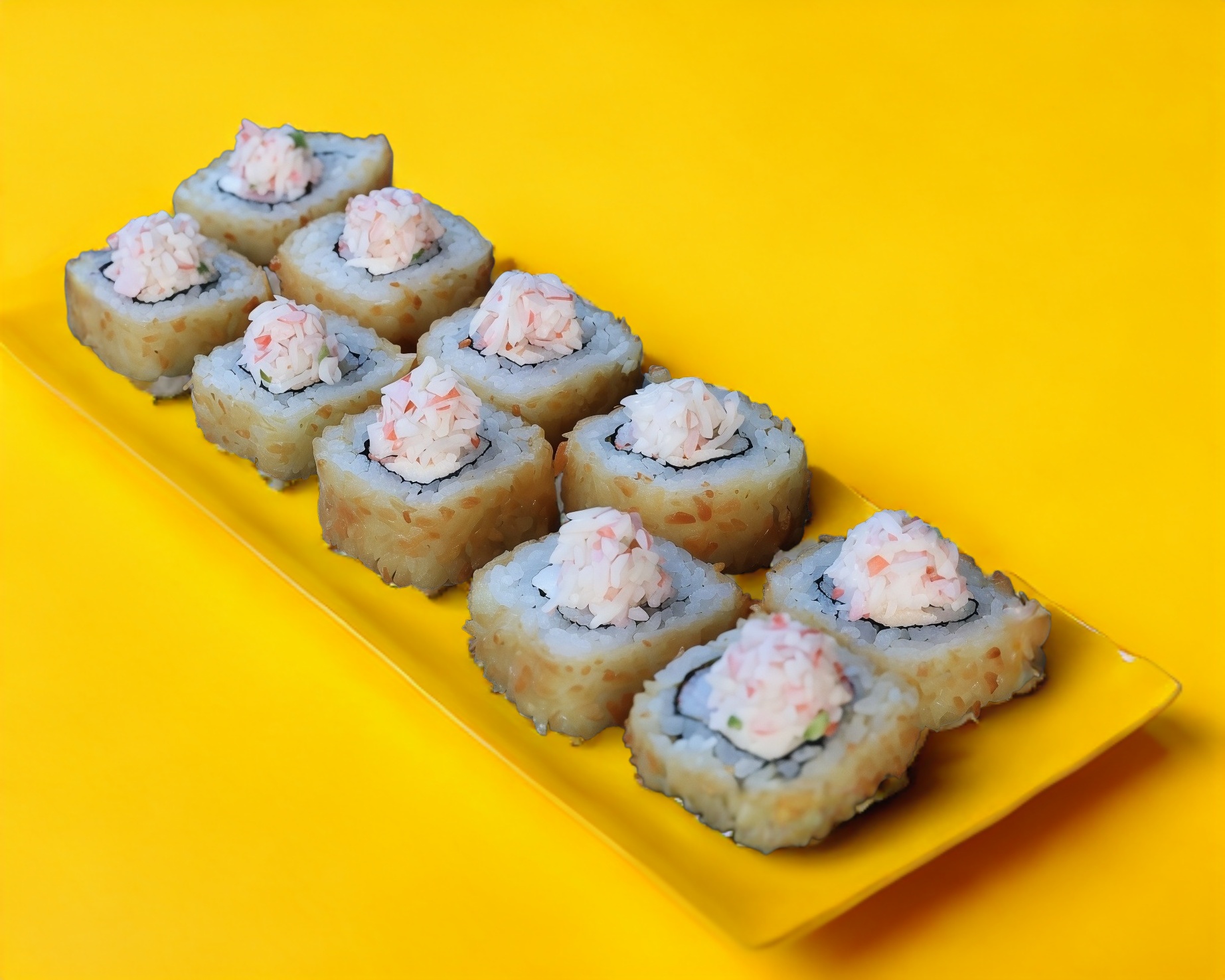 Camarón, aguacate y queso crema por dentro y topping de camarón roca en trocitos.