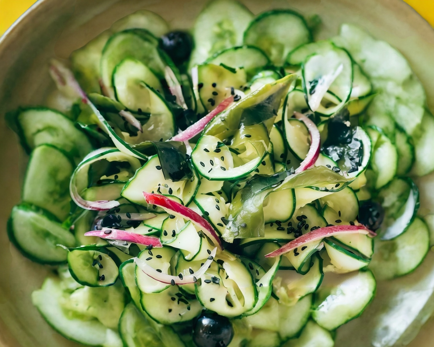 Noodles de pepino, surimi, furikake, con aderezo de soya y vinagre.