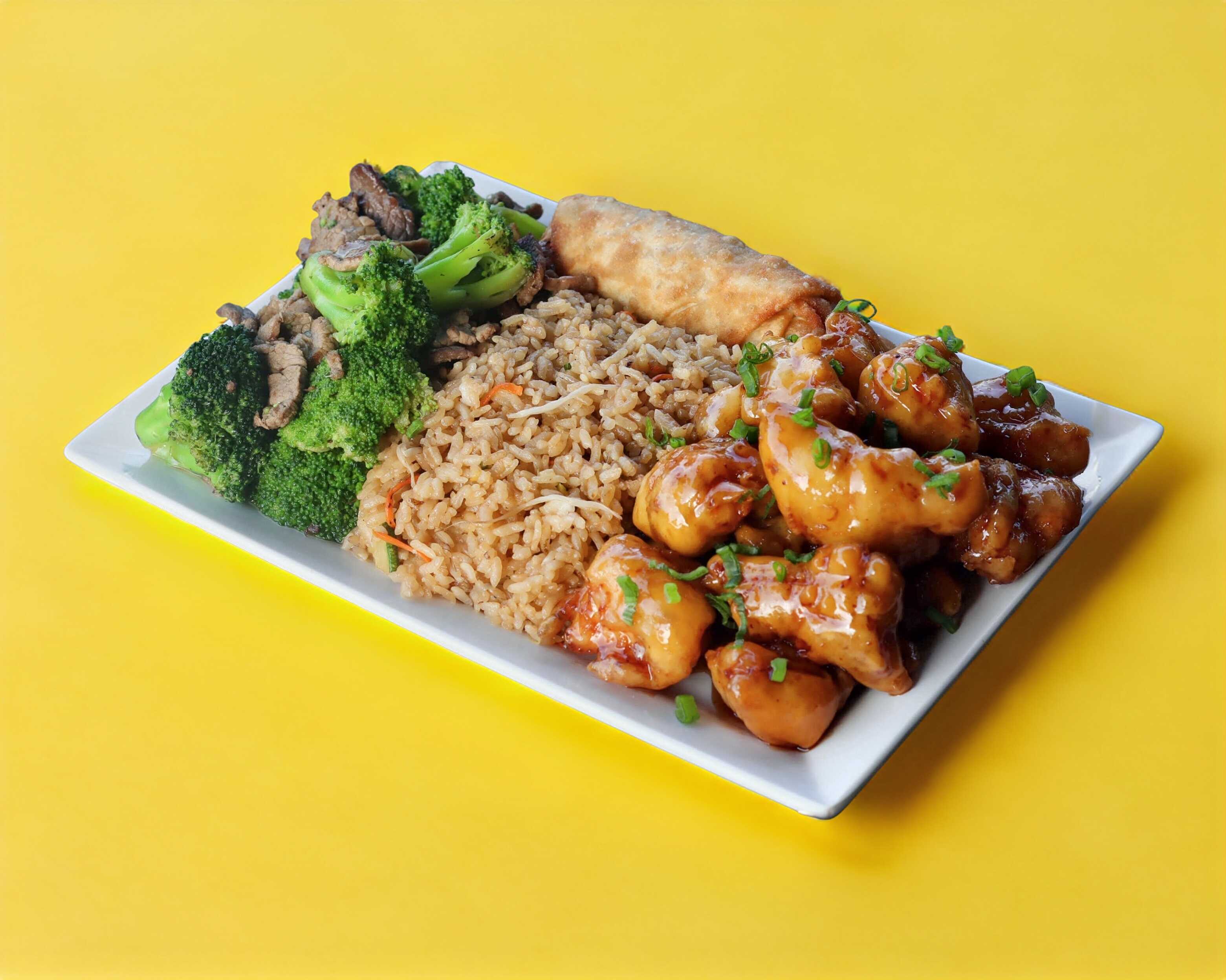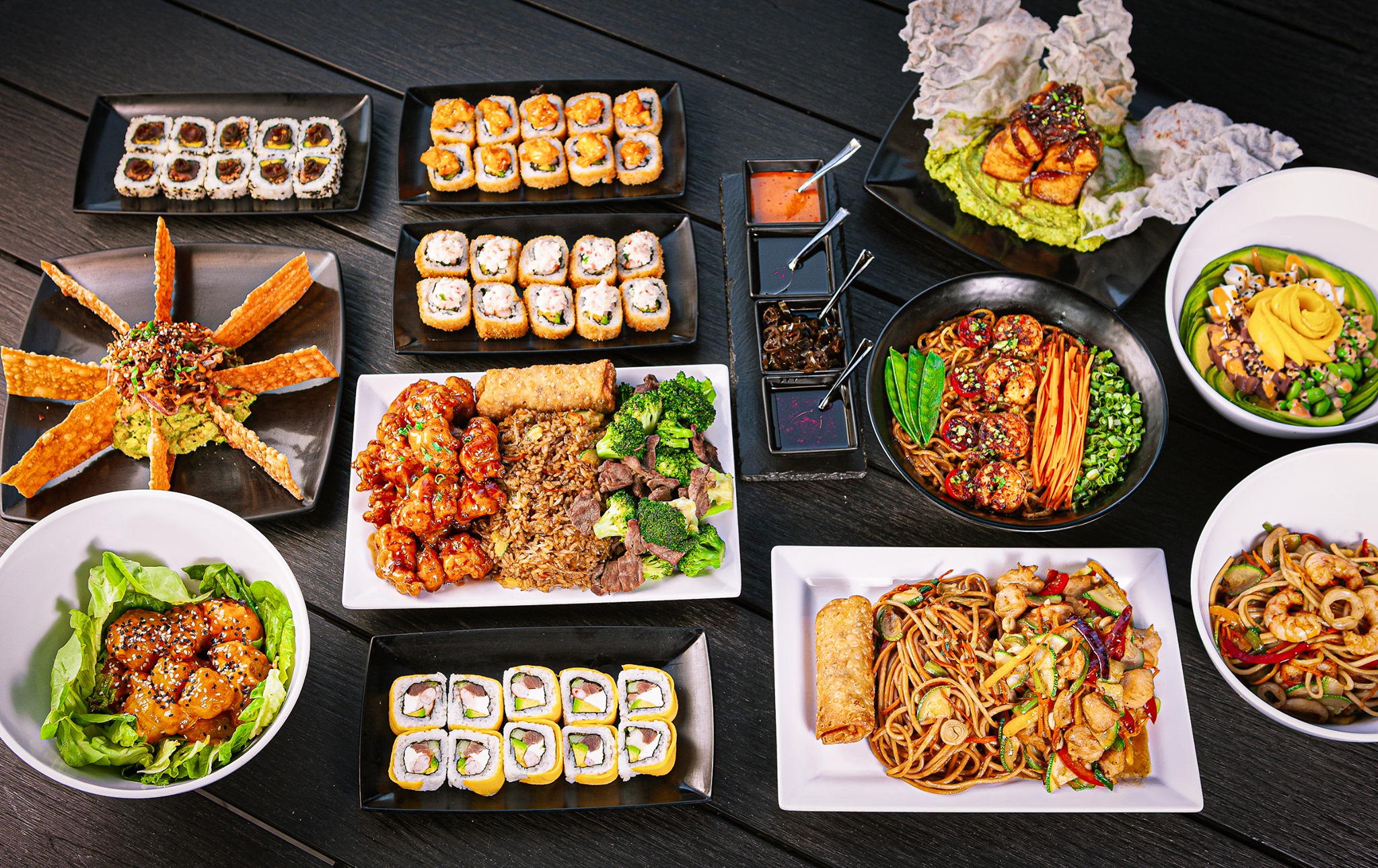 Arroz gohan clásico, frito clásico o lo mein clásico más 2 woks a elegir, 1 egg roll clásico, veggie o chipotle y 1 sushi a elegir.