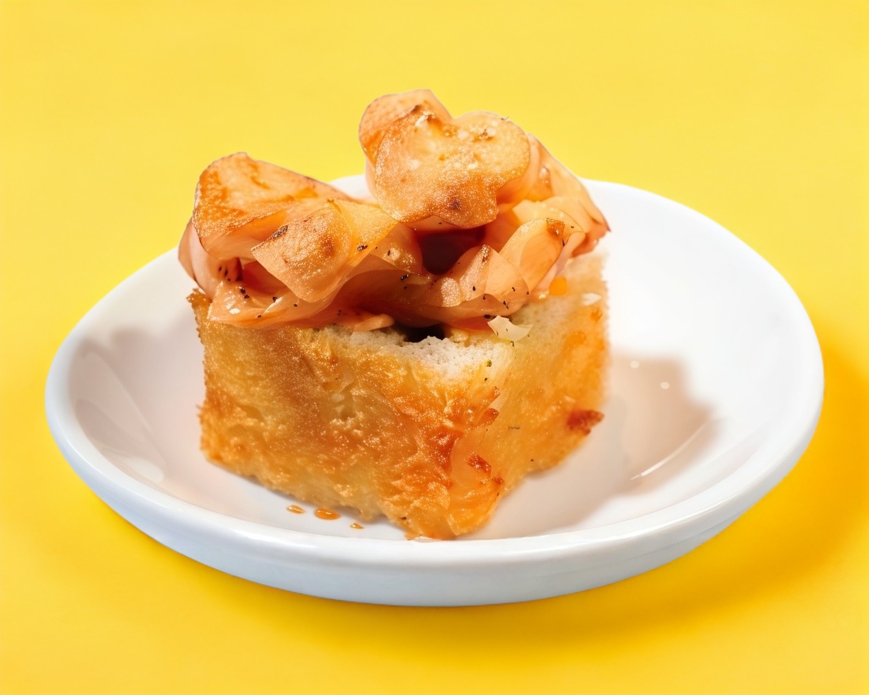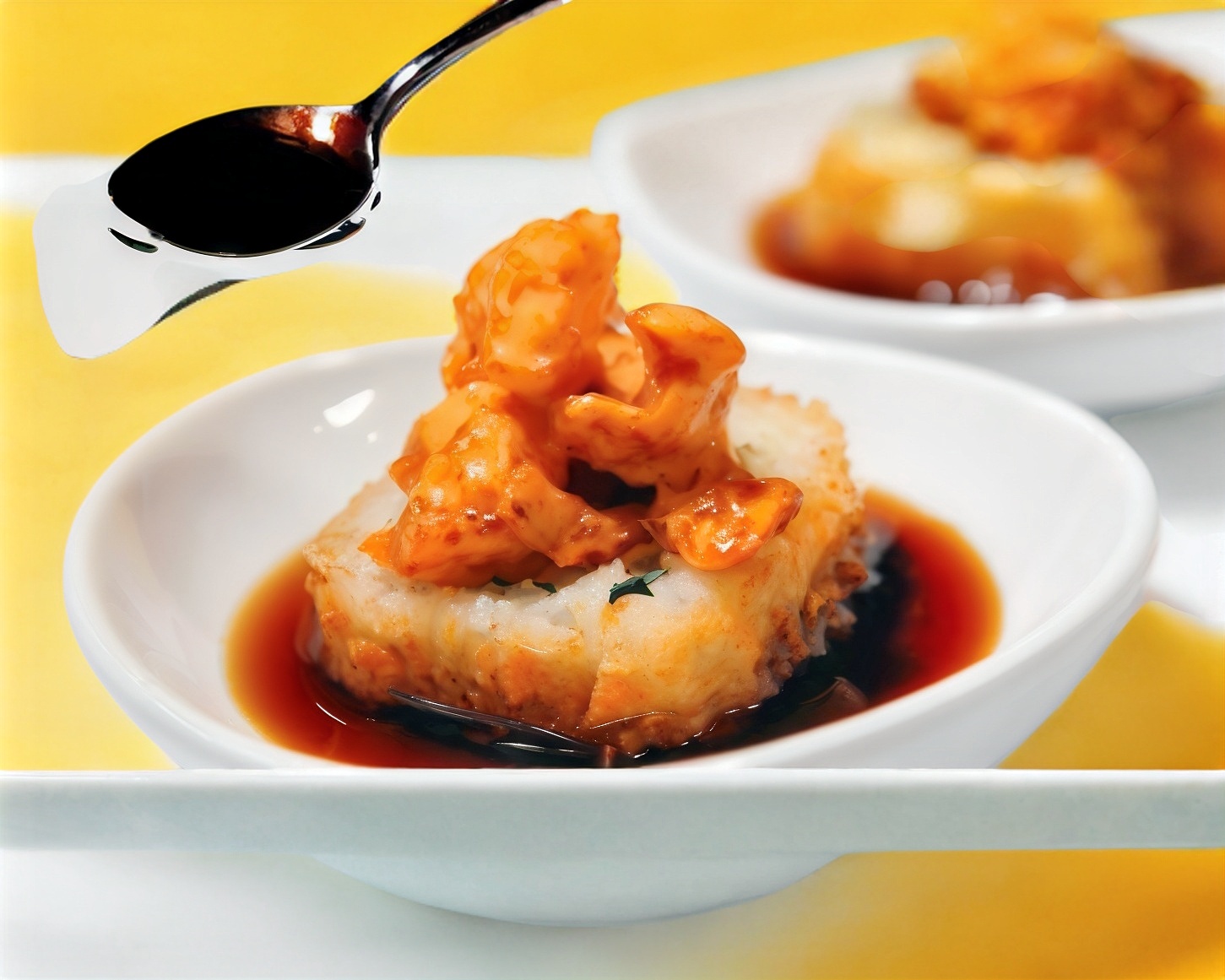 Cubos de salmón dorados con aderezo de mostazo y anguila, cebolla caramelizada y furikake sobre guacamole, viene acompañadas con tostadas de harina.