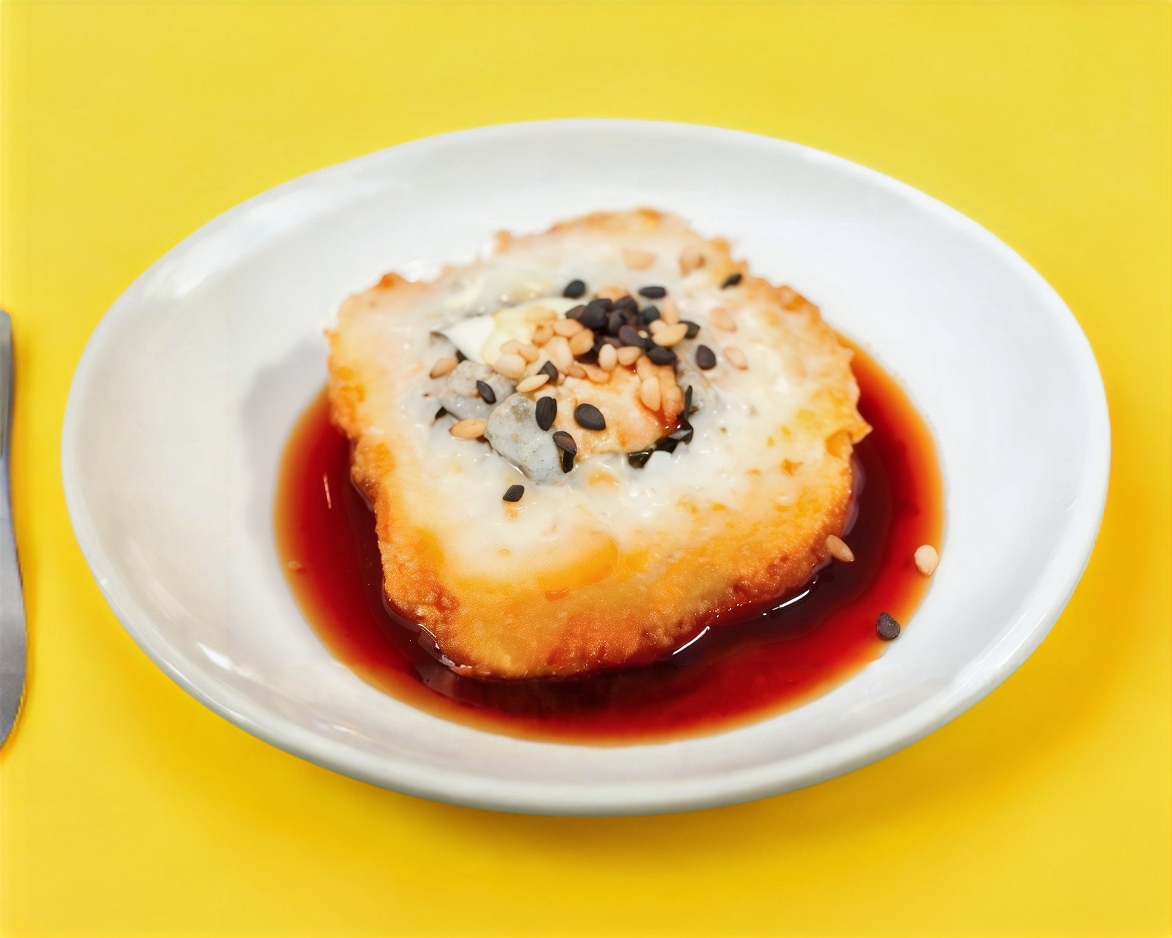 Surimi, camarón, queso crema, aguacate por dentro y topping de Tampico. Empanizado por fuera