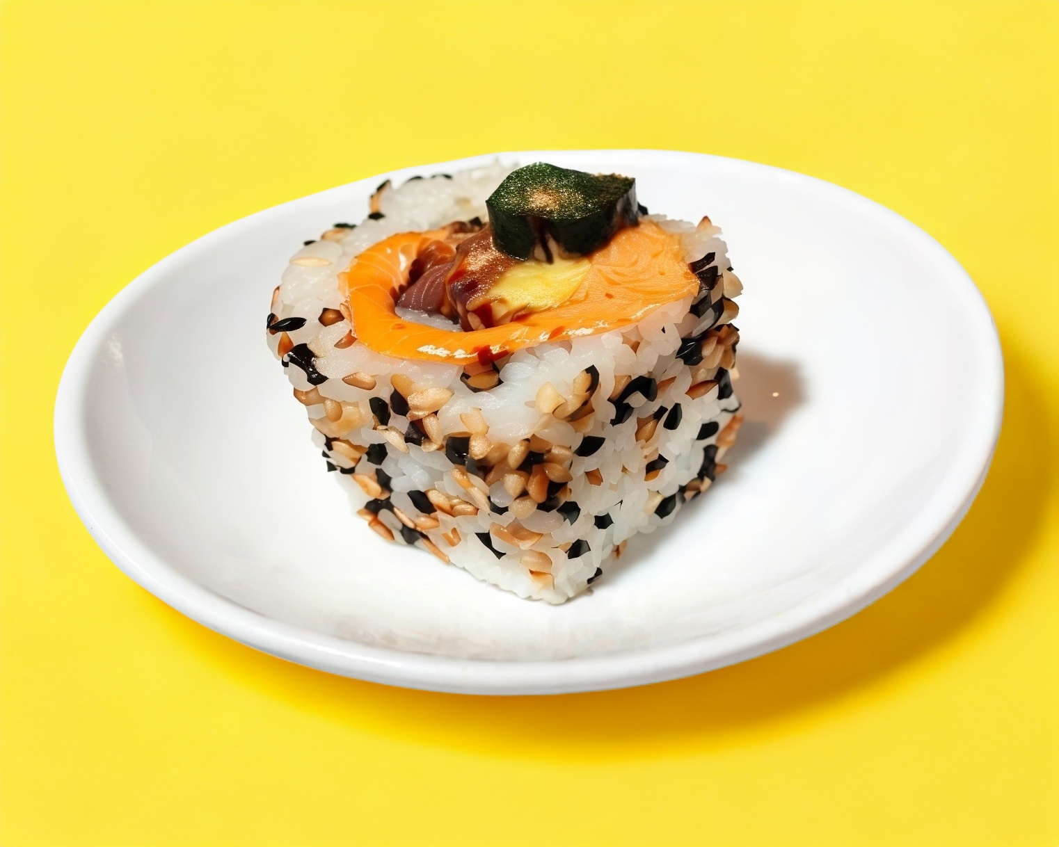 Nigiri de medallón de atún cubierto con ajonjolí, cebolla y aguacate. Orden de 2 piezas.