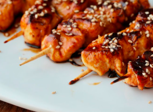 2 brochetas de camarón en adobo de chiles a la parrilla.