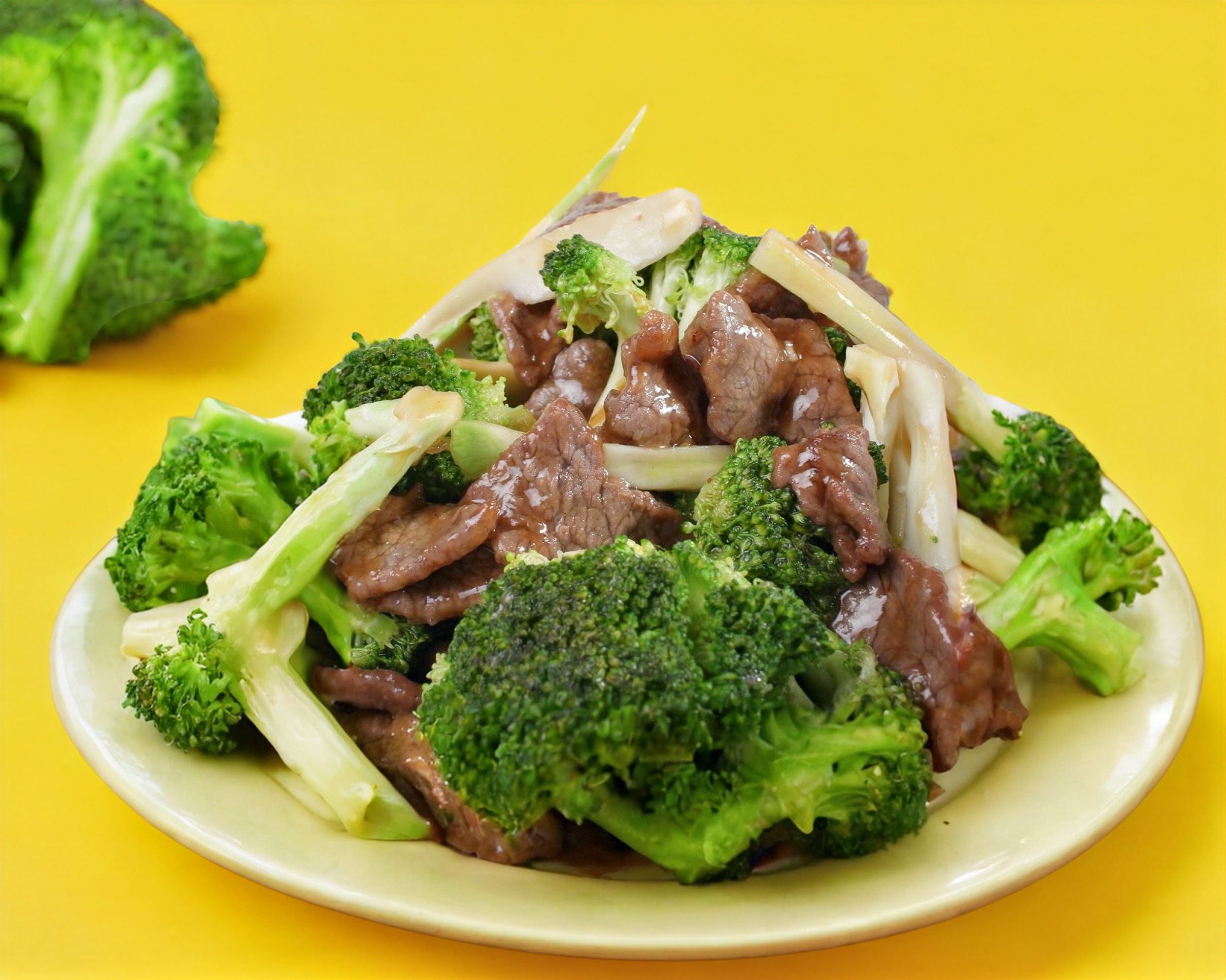 Trocitos de carne de res salteados con broccoli y salsa de ostión.