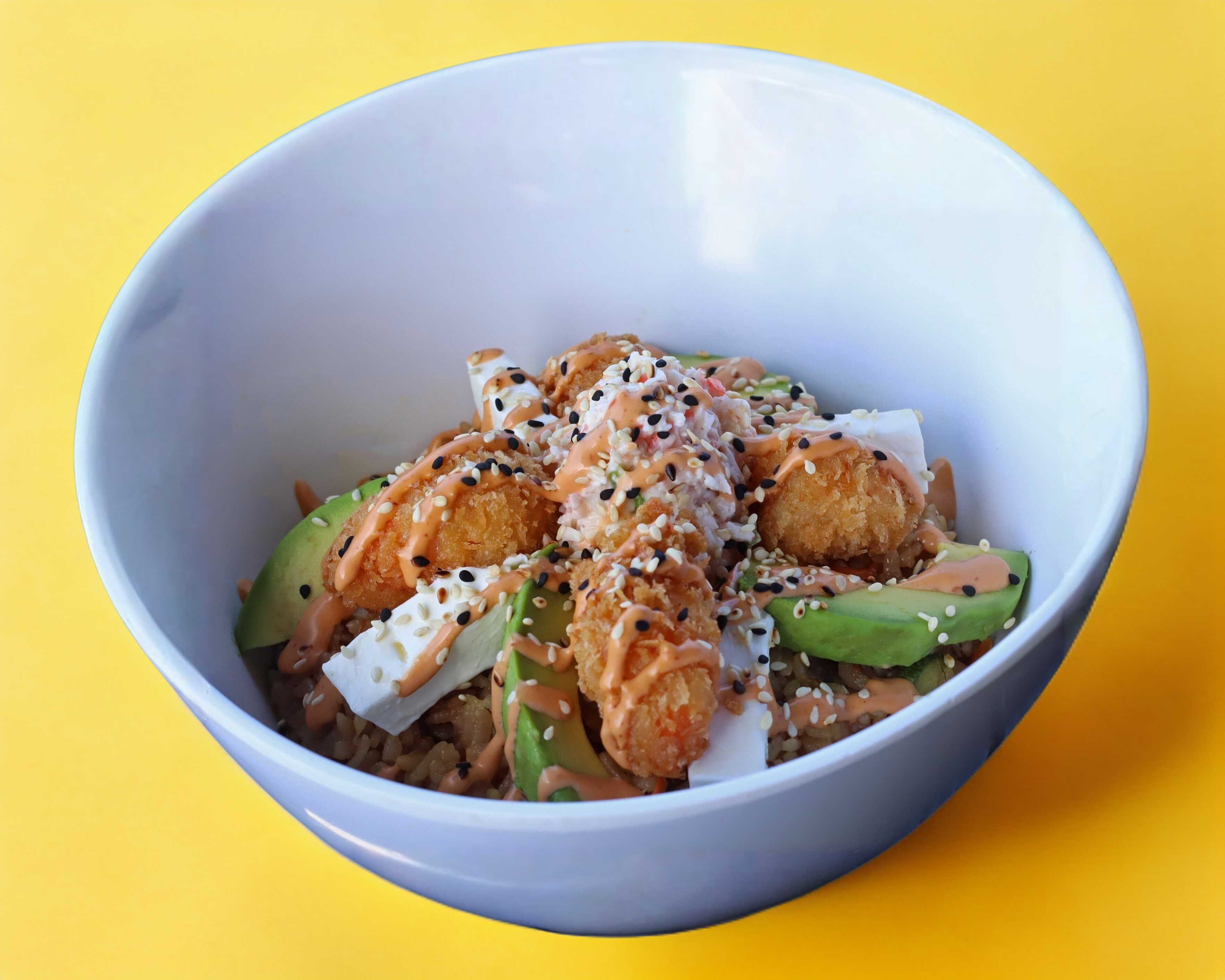 Arroz frito con rebanadas de aguacate, Tampico, queso crema,trocitos de camarón empanizados, aderezo chipotle con salsa de anguila y ajonjolí.