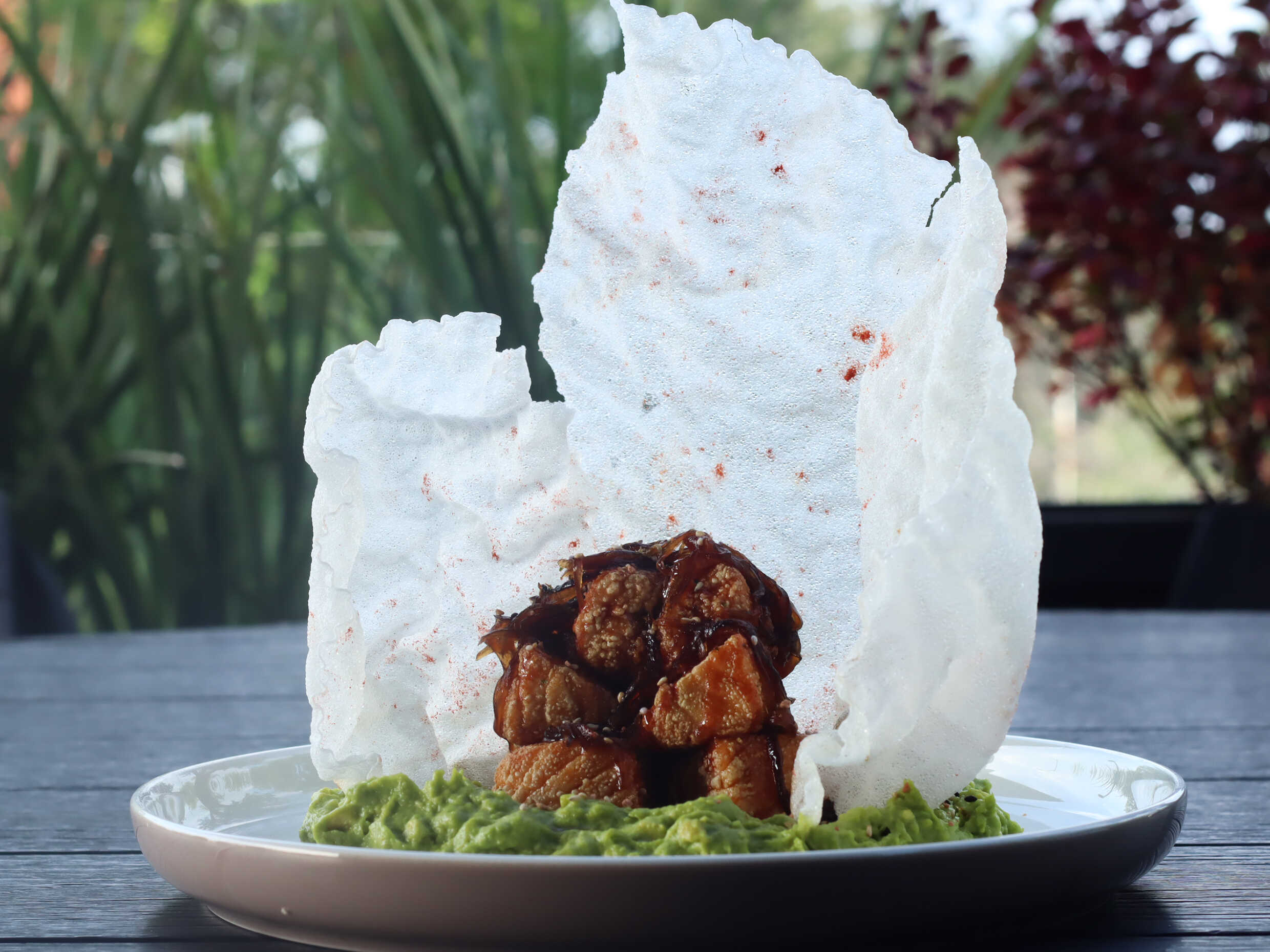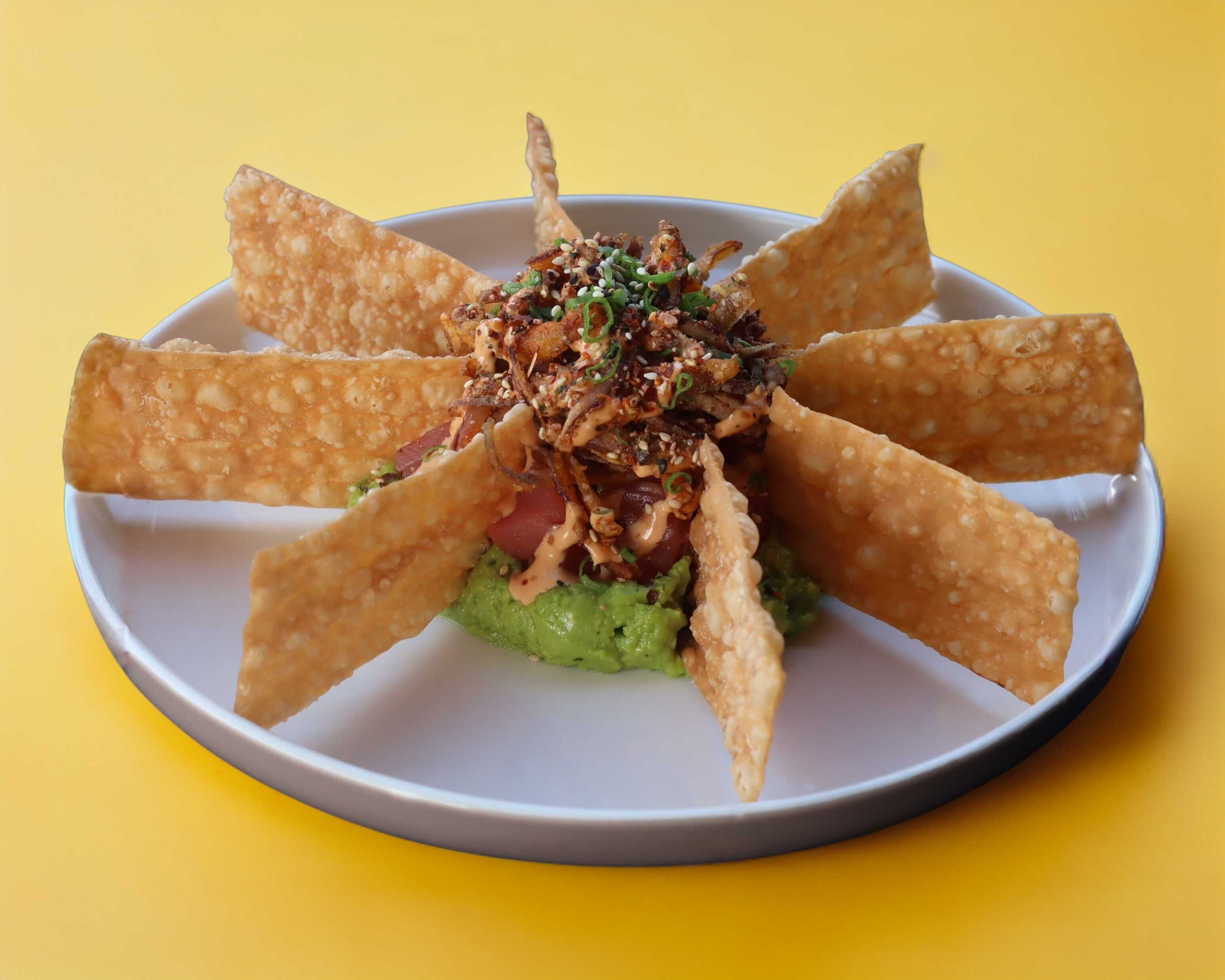 Medallón de atún en cubos marinados con soya seshwon y aceite de ajonjolí sobre guacamole topping de cebolla crocante, cebollín, chicle quebrado, aderezo chipotle y furikake. Va acompañado con tostados de wonton.